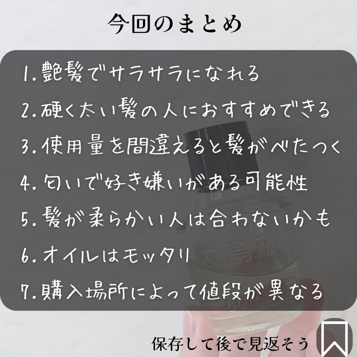 | ヘアケア・スタイリングランキング第12位 | さらっとした扱いやすいオイル ! ドライヤーの前に使うのはもちろん、乾いた髪につけてもベタつかなくてすごい! | 詳細を見る | |