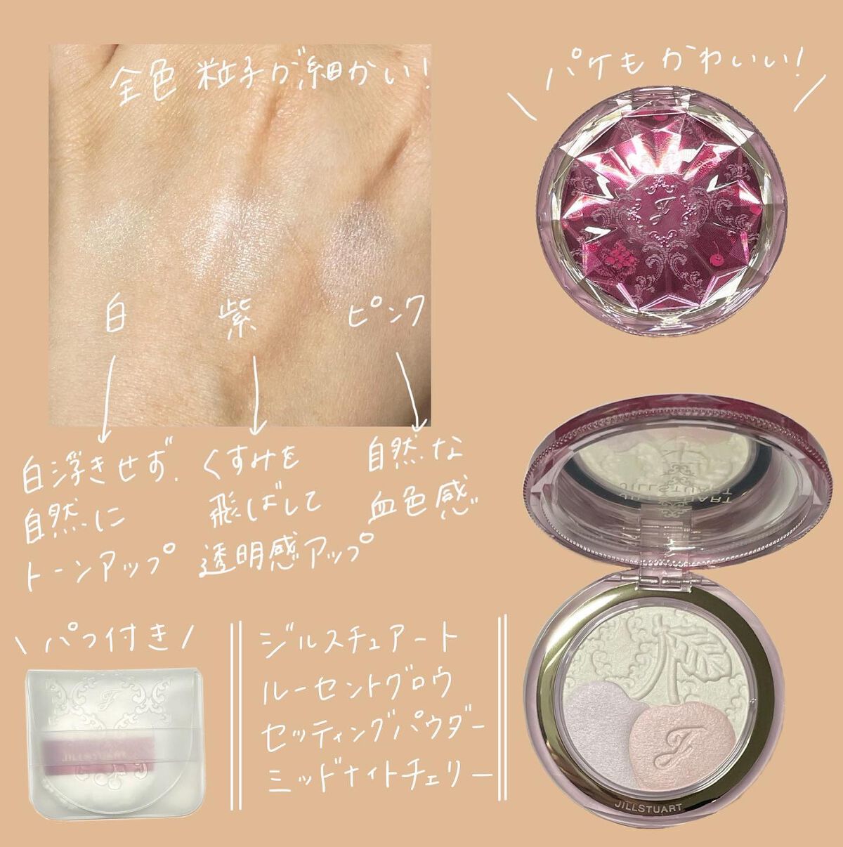 とにかく潤いがすごい! 私は混合肌で鼻以外の乾燥が気になるので、潤い系の下地が手放せないのですが、この下地は本当に水分爆弾でした、、! パール入りでくすみを飛ばして自然な美肌へ よーーくみると、細かいパールが入っています。このパールのおかげで、肌のくすみを飛ばして、均一な肌になります。 ほんのりピンクで血色感UP コントロールカラーほどのピンクではなくて、ほんのりピンクなのがポイント。ベージュとピンクの間ぐらいです。