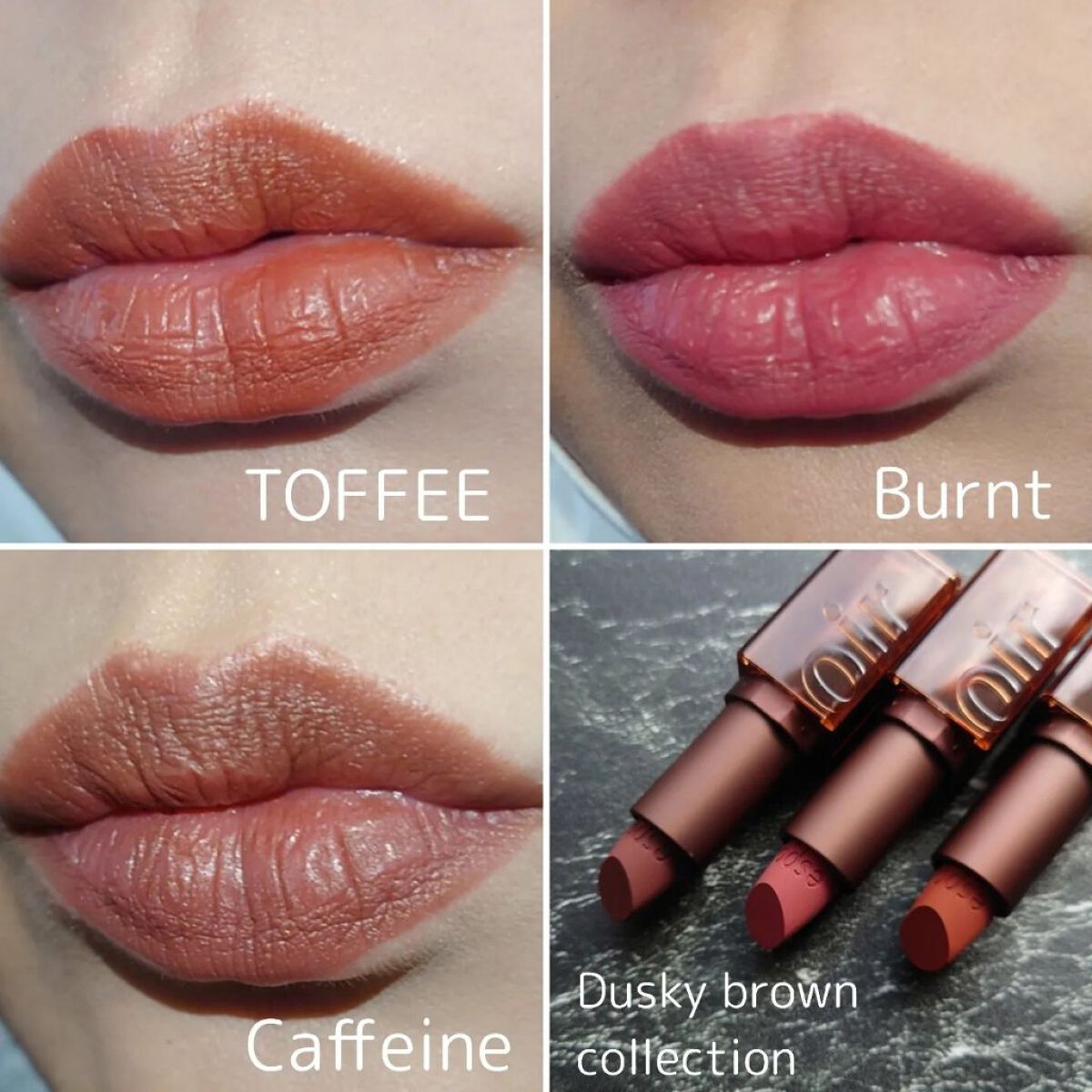 これね、マットなのにパサつかないし、ほわっとした発色でめちゃくちゃつけ心地が良い。 色もほんとに絶妙にくすんでるから、割とどんなメイクにも派手にならずに合わせられる!!! 色持ちも良いよ!! ティッシュオフでいなくならない!!! わたしは、特にプラムがお気に入りです🥺💞 ちなみに今日もプラムです🥰 ブラウンもあったからおいおい買う予定です😂💞