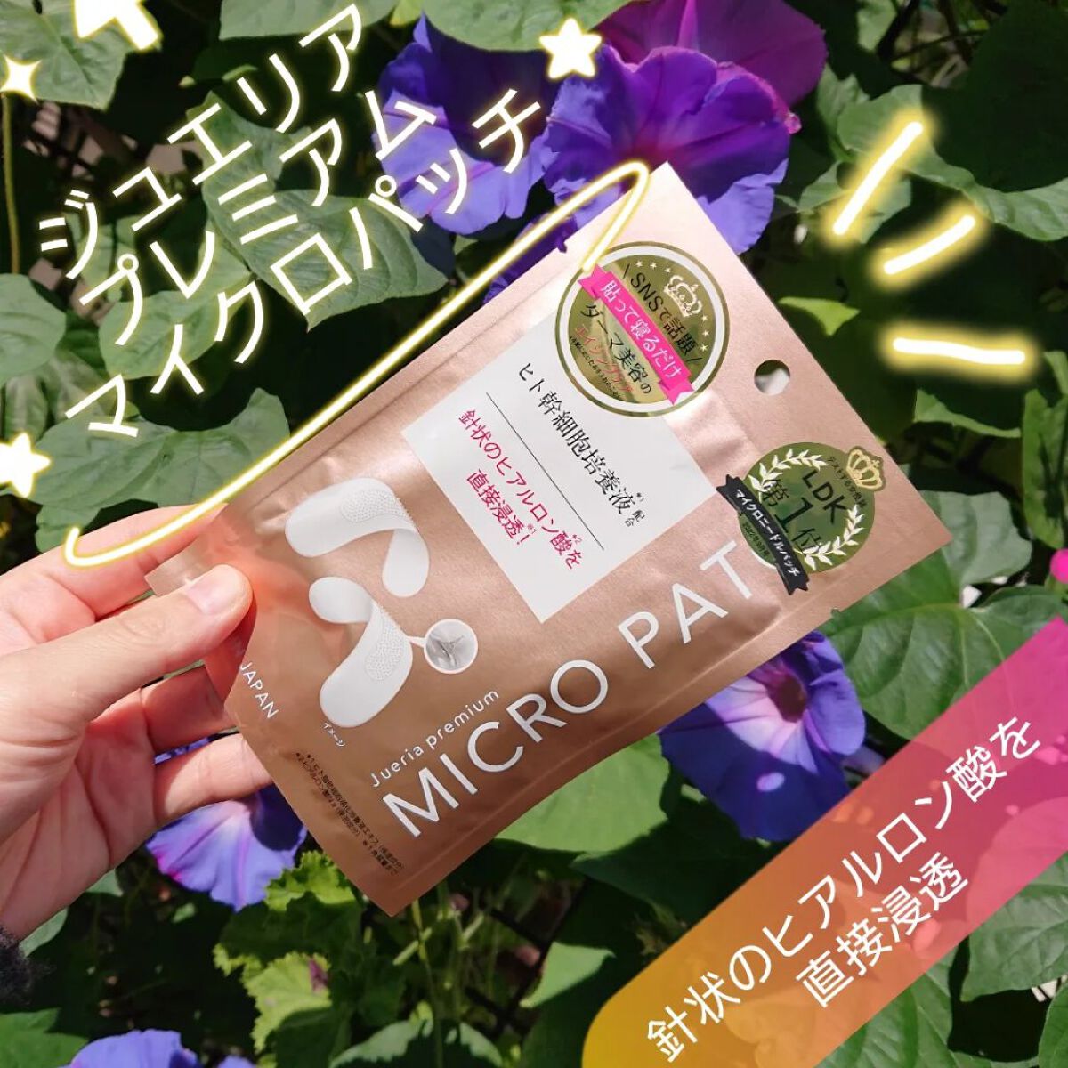 - 寝る前のスペシャルケア 針状のマイクロパッチ これ1つに6種類の美容保湿・整肌成分を配合しました。 (ヒト幹細胞培養液エキス*1、ヒアルロン酸*2、プラセンタエキス*3 、E G F*4、F G F*5 、コラーゲン*6) ①形状にもこだわりました! シート状にマイクロサイズの針状のヒアルロン酸*2をぎっしり成形。 先端が細く角質層のすみずみまでお肌に美容保湿成分をたっぷり届けます。 ②貼って寝るだけ楽チンケア 貼って寝るだけ簡単ケア!気になる目元・口元に、手軽にいつでも、どこでも、スペシャルケアができます。 ③ニードルの長さにも注目! 肌の角質層までしっかり届けるためにこだわりの高さに調整しました。 シート状の美容保湿成分が角質層まで浸透します。 ④品質にもこだわりました! 直接お肌に触れるからこそ、ジュエリアプレミアムは国内設計・国内生産にこだわりました。肌にうれしいメイドインジャパンです。 *1 ヒト脂肪細胞順化培養液エキス(保湿成分) *2 ヒアルロン酸Na(保湿成分) *3 整肌成分 *4 ヒト遺伝子組換オリゴペプチド-1(整肌成分) *5 ヒト遺伝子組換ポリペプチド-11(整肌成分) *6 加水分解コラーゲン(保湿成分)