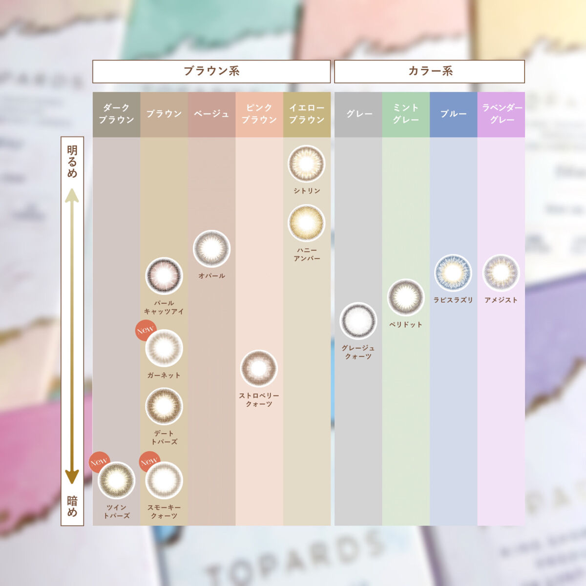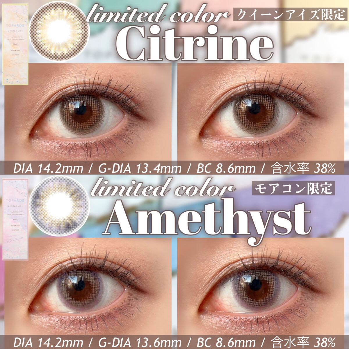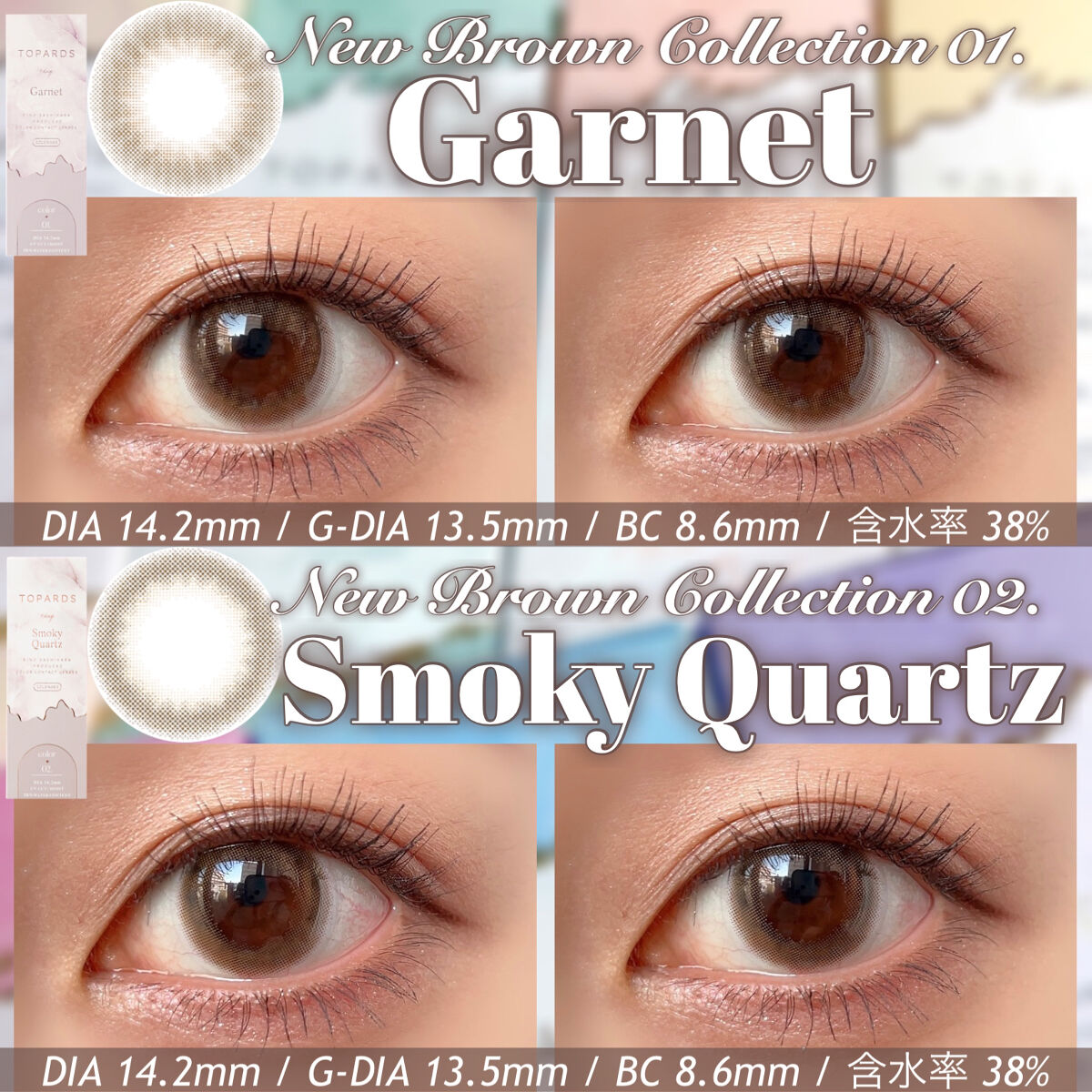 ▼トパーズ推しカラコン2選🪄💫【TOPARDS/1day】TOPARDS(トパーズ)全18色/各1,760円(税込)【カラー】#ガーネット#スモーキークォーツ《レンズスペック》使用期間:1dayレンズ直径(DIA):14.2mm着色直...