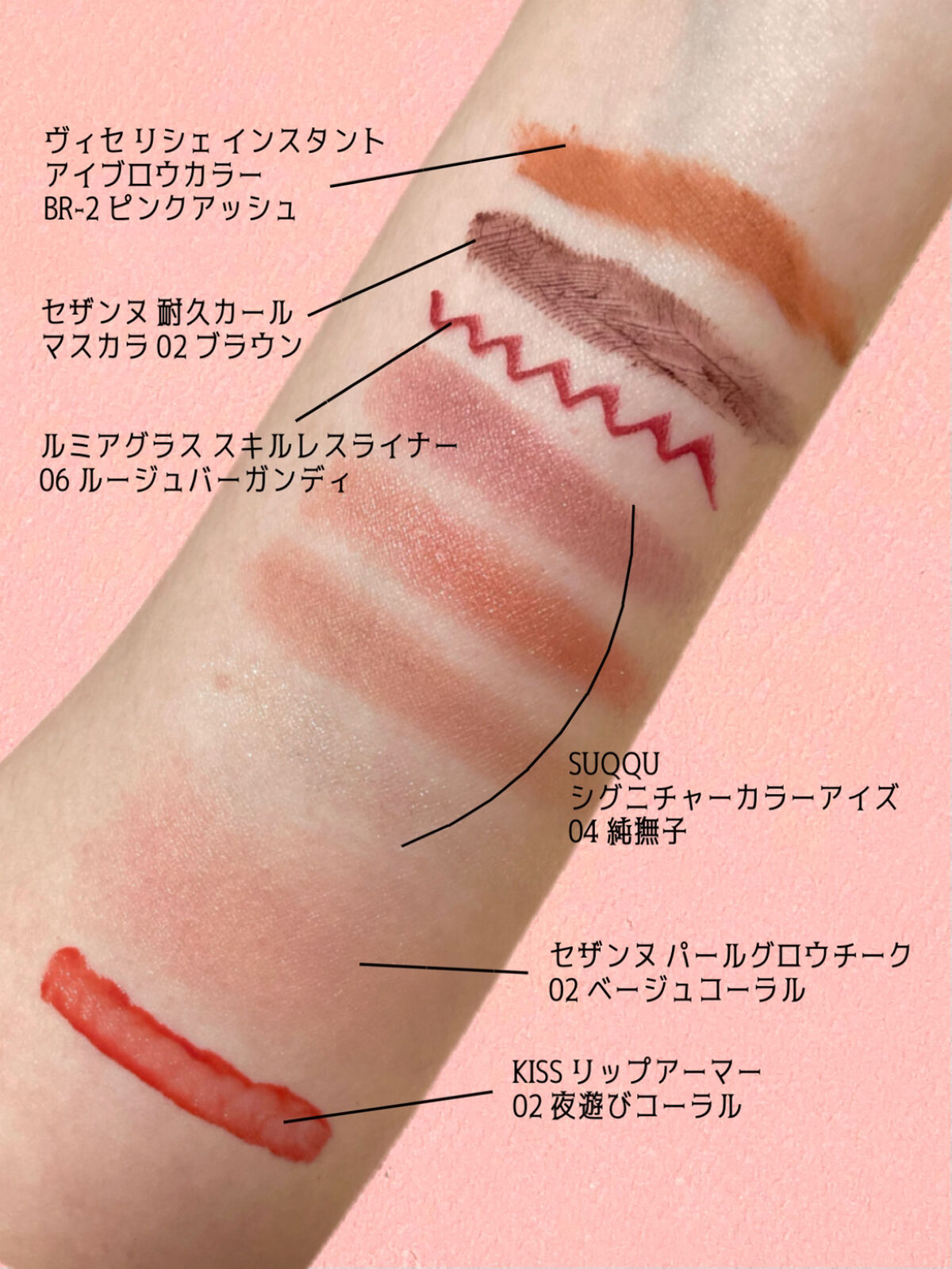 アイブロウパウダーはBR-8(限定色)ホワイティッシュピンク🩷 3色を自在に組み合わせて、ふんわり眉と陰影のある鼻筋を演出してくれるアイブロウパウダーなの🎨 インスタントアイブロウカラーーはBR-6(限定色)ホワイトピンク こちらは眉マスカラ。白っぽさのあるアッシュピンクカラーながら、眉毛に塗ってみると馴染みがよくて想像していたカラーリングしたようなアッシュ系の明るめなピンクブラウンカラーに仕上げてくれた🩷 小ぶりなブラシが眉毛に塗りやすく発色も良くて使い勝手も満足🥰 眉毛をカラーリングしなくても、なりたいカラーをメイクで仕上げてくれるよ!