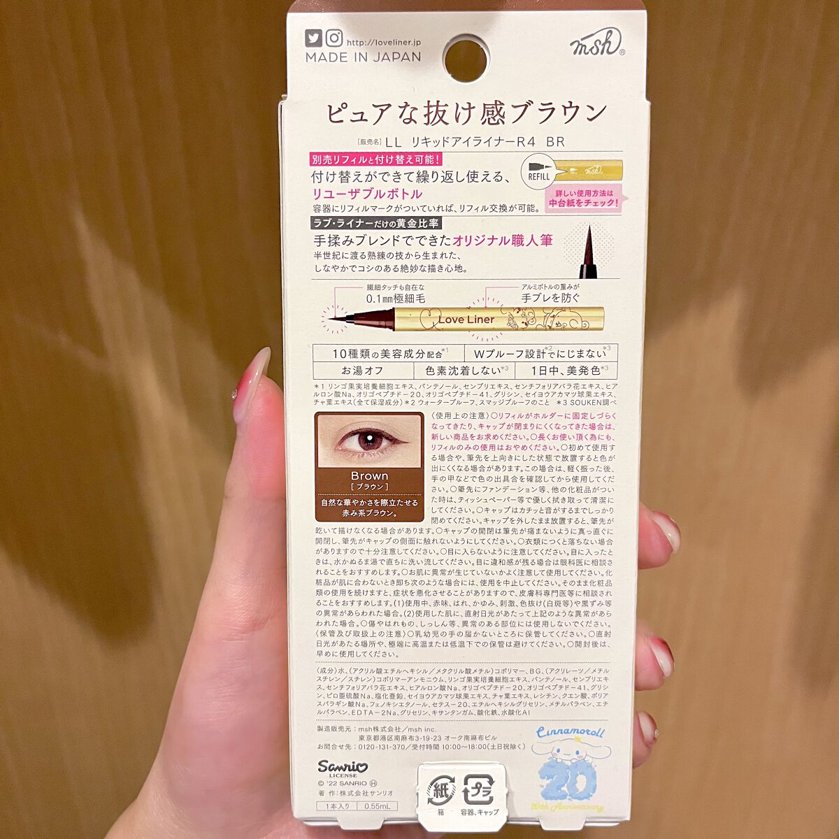 - 「0.1mmの極細毛の筆先」、「手ブレを防ぐ重さのあるアルミボトル」、「ウォータープルーフ&スマッジプルーフ」、「ぬるま湯で簡単オフ」という特長は従来品から引き継ぎ、新たに3つの特長をプラスしました。 1.ラブ・ライナー史上初!つけ替えができて繰り返し使える「リユーザブルボトル」に進化 筆とインクがセットになった専用リフィルをつけ替えることで、お気に入りのボトルを繰り返し使うことができます。 2.ラブ・ライナーだけの黄金比率。職人の手もみブレンドでできたオリジナル職人筆 筆づくり発祥の地、奈良の筆職人の手もみの技によるラブ・ライナーだけのオリジナル職人筆を採用。新素材をラブ・ライナー独自の比率でブレンドし、まぶたに最もふさわしいやわらかさとコシのバランスで、ラブ・ライナー史上最高の描き心地を実現。 3.10種類の美容成分配合※ 従来品に配合していた5種類の美容成分に加え、まつげケアを叶える美容成分を新規配合。合計10種類の美容成分※でメイクするたびに美しい目元へ。 ※保湿成分のこと