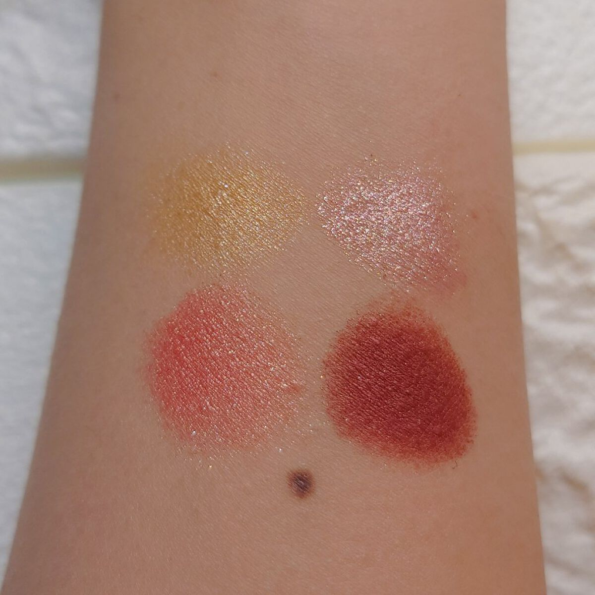 発色が綺麗 見たままの色味 全部ブレンドした色が1番可愛い ピンク〜オレンジピンクのカラー展開がいい アイシャドウと同じサイズなのが 収納とかで助かる〜🥹🙏 キャンディのようなポップな色味で 肌にすっと滑らせるだけで 顔も華やかになるかわいいチークです🩷🎀