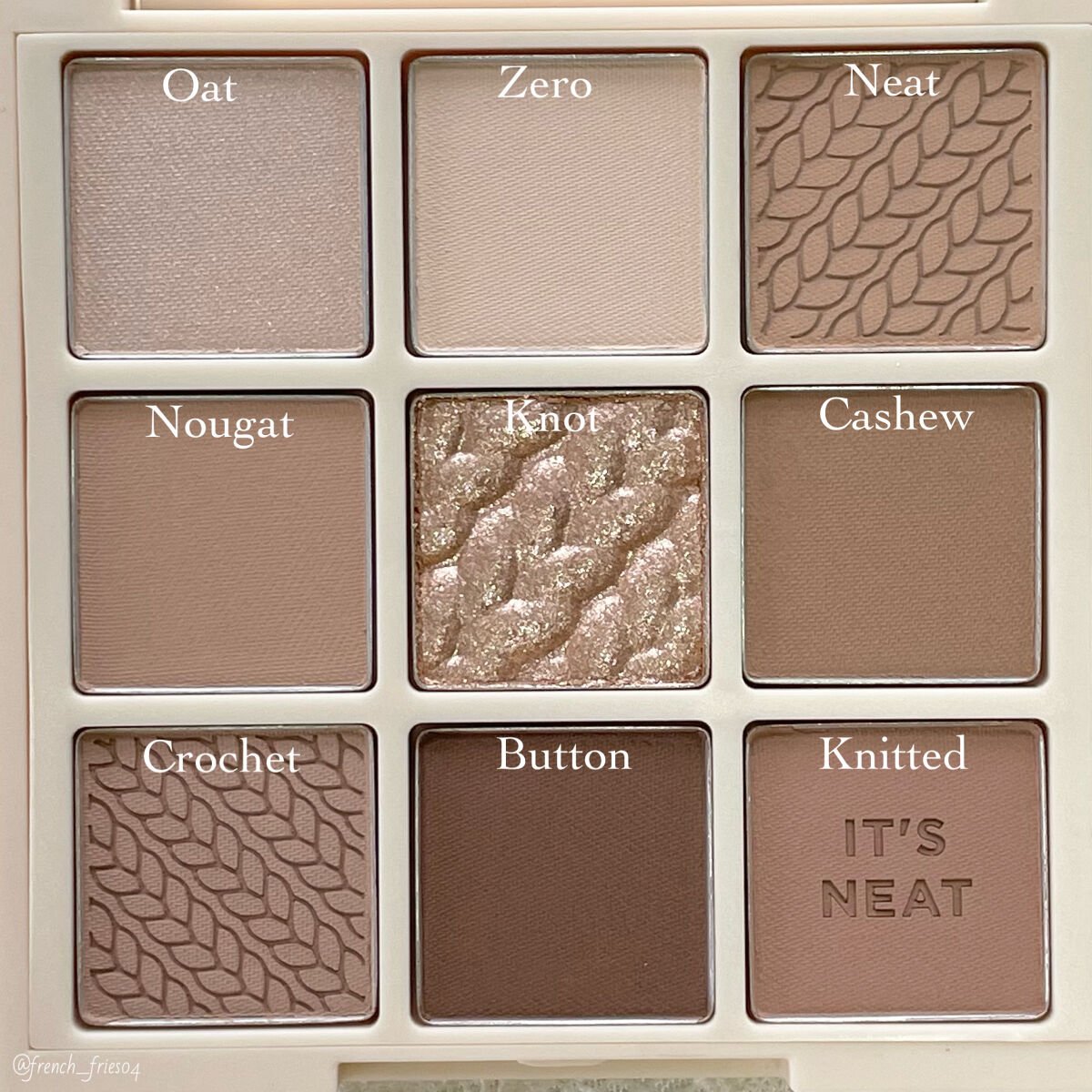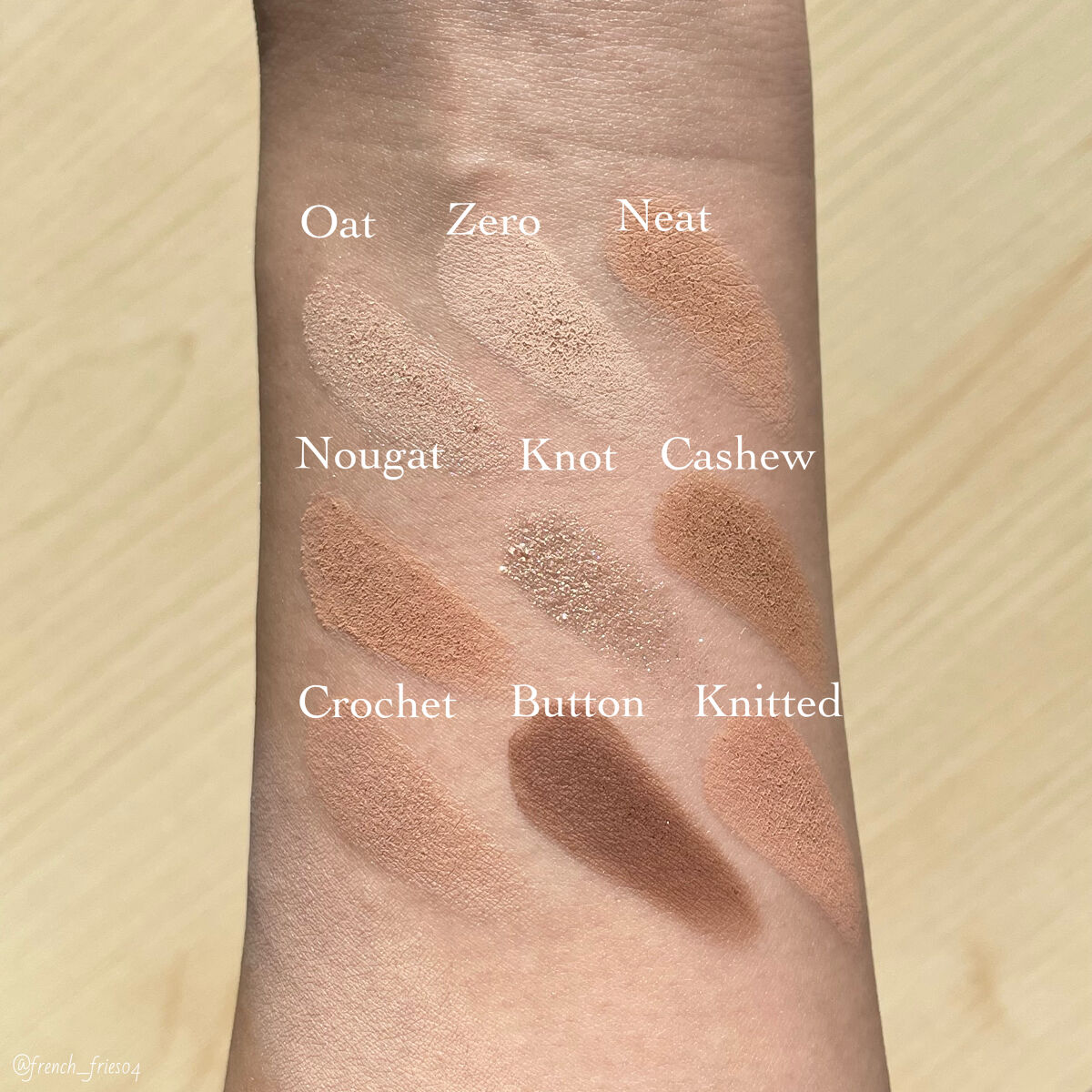 - <05 ニートニット> 〈Oat-A〉タルク、合成フルオロフロゴパイト、窒化ホウ素、リンゴ酸ジイソステアリル、ミリスチン酸Mg、シ リカ、 ナイロン-12、 トリ(カプリル酸/カプリン酸)グリセリル、 メチルプロパンジオール、 マカデミア種子油、 ジ メチコン、ステアリン酸Mg、プロパンジオール、ラウロイルリシン、ヒドロキシプロピルビスパルミタミドMEA、ス テアリン酸ジメチコノール、トリエトキシカプリリルシラン、水酸化Al、メチコン、カオリン、水、香料、マイカ、酸化チ タン、酸化鉄、マンガンバイオレット、グンジョウ 〈Zero-B〉タルク、ナイロン-12、窒化ホウ素、ミリスチン酸Mg、 シリカ、 ジエチルヘキサン酸ネオペンチルグリコール、 フェニルトリメチコン、 メチルプロパンジオール、 ヘキサ(ヒ ドロキシステアリン酸/ステアリン酸/ロジン酸)ジペンタエリスリチル、 リンゴ酸ジイソステアリル、 ネオペンタン 酸イソステアリル、 ステアロイルオキシステアリン酸オクチルドデシル、 ステアリン酸Mg、 プロパンジオール、 ジメ チコン、ポリブテン、水添レシチン、 トリエトキシカプリリルシラン、水酸化Al、ラウロイルリシン、カオリン、水、香 料、マイカ、酸化チタン、酸化鉄、マンガンバイオレット、グンジョウ 〈Neat-C〉タルク、窒化ホウ素、シリカ、ステア ロイルオキシステアリン酸オクチルドデシル、フェニルトリメチコン、ジメチコン、ミリスチン酸Mg、ナイロン-12、 メチルプロパンジオール、 ヘキサ(ヒドロキシステアリン酸/ステアリン酸/ロジン酸)ジペンタエリスリチル、 マカ デミア種子油、 リンゴ酸ジイソステアリル、 水酸化Al、 プロパンジオール、 トリエトキシカプリリルシラン、 ステアリ ン酸Mg、ラウロイルリシン、サラソウジュ種子脂、水、カオリン、香料、マイカ、酸化チタン、酸化鉄、マンガンバイオ レット 〈Nougat-D〉タルク、合成フルオロフロゴパイト、シリカ、トリ(カプリル酸/カプリン酸)グリセリル、ミリス チン酸Mg、ステアリン酸Mg、マカデミア種子油、ジメチコン、メチルプロパンジオール、トリエトキシカプリリルシ ラン、ジミリスチン酸Al、プロパンジオール、カオリン、水酸化Al、マルトデキストリン、水、香料、マイカ、酸化鉄、 マンガンバイオレット、酸化チタン、グンジョウ、カルミン 〈Knot-E〉水、ホウケイ酸(Ca/Na)、合成フルオロフロ ゴパイト、ホウケイ酸(Ca/チタン)、ホウケイ酸(Ca/Al)、ジメチコン、ステアロイルオキシステアリン酸オクチル ドデシル、リンゴ酸ジイソステアリル、グリセリン、ミリスチン酸Mg、パルミチン酸イソプロピル、シリカ、オクテニ ルコハク酸デンプンAl、ステアリン酸Mg、ペンチレングリコール、ポリソルベート20、トリエトキシカプリリルシラ ン、 (アクリルアミド/アクリロイルジメチルタウリンNa)コポリマー、 酸化スズ、 ケイ酸(Al/Mg)、 オリーブ油脂 肪酸ソルビタン、ステアリン酸ソルビタン、イソヘキサデカン、フェノキシエタノール、ソルビン酸K、エチルヘキシル グリセリン、デヒドロ酢酸Na、ポリソルベート80、オレイン酸ソルビタン、トコフェロール、マイカ、酸化チタン、酸 化鉄 〈Cashew-F〉タルク、窒化ホウ素、ナイロン-12、ジエチルヘキサン酸ネオペンチルグリコール、シリカ、フェ ニルトリメチコン、ミリスチン酸Mg、メチルプロパンジオール、リンゴ酸ジイソステアリル、ヘキサ(ヒドロキシステ アリン酸/ステアリン酸/ロジン酸)ジペンタエリスリチル、 ネオペンタン酸イソステアリル、 ステアロイルオキシス テアリン酸オクチルドデシル、ステアリン酸Mg、プロパンジオール、ジメチコン、ポリブテン、水添レシチン、ラウロ イルリシン、水酸化Al、メチコン、トリエトキシカプリリルシラン、カオリン、水、香料、マイカ、酸化チタン、酸化鉄、マンガンバイオレット 〈Crochet-G〉タルク、窒化ホウ素、リンゴ酸 ジイソステアリル、ナイロン-12、シリカ、ミリスチン酸Mg、トリ(カプリル酸/カプリン酸)グリセリル、ステアリン酸Mg、メチルプロパンジオール、ステアリン酸ジメチコノール、 プロパンジオール、ジメチコン、ラウロイルリシン、ヒドロキシプロピルビスパルミタミドMEA、トリエトキシカプリリルシラン、カオリン、水酸化Al、メチコン、水、香料、マイカ、酸化 鉄、酸化チタン、マンガンバイオレット、グンジョウ 〈Button-H〉タルク、シリカ、リンゴ酸ジイソステアリル、窒化ホウ素、ナイロン-12、ミリスチン酸Mg、トリ(カプリル酸/カプリ ン酸)グリセリル、ステアリン酸Mg、メチルプロパンジオール、マカデミア種子油、ジメチコン、プロパンジオール、ステアリン酸ジメチコノール、ラウロイルリシン、ヒドロキシプロ ピルビスパルミタミドMEA、カオリン、トリエトキシカプリリルシラン、水酸化Al、メチコン、マルトデキストリン、水、香料、マイカ、酸化鉄、マンガンバイオレット、酸化チタン、グン ジョウ、カルミン、黄4 〈Knitted-I〉タルク、シリカ、ステアロイルオキシステ