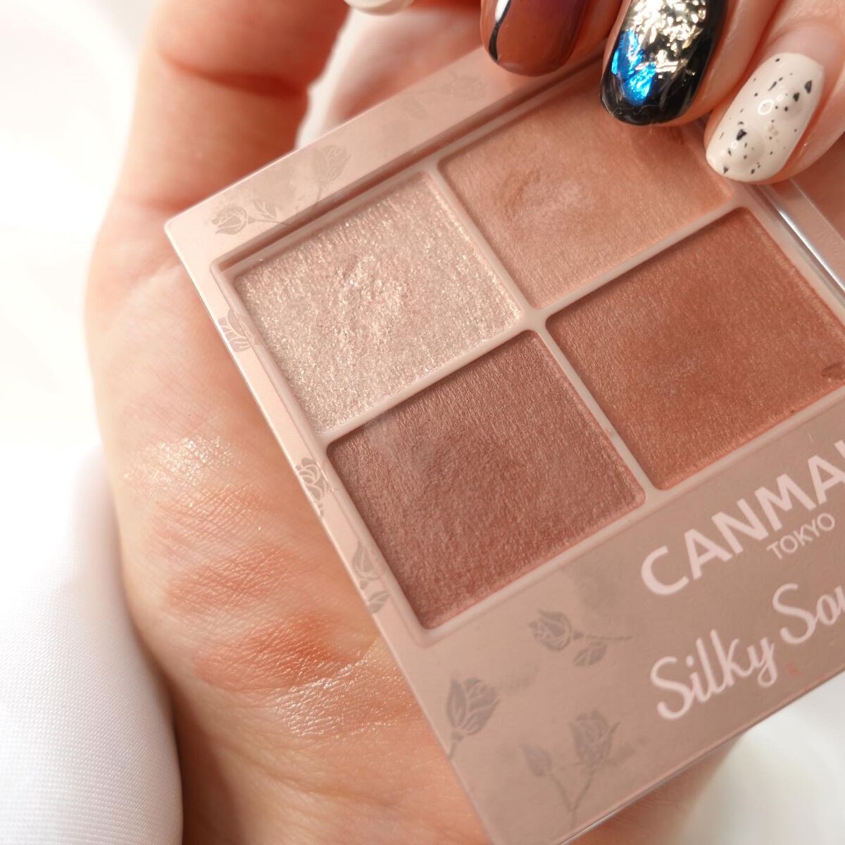 - シルキースフレアイズの姉妹品♡ 肌に溶け込むような透けマットシャドウ 透け感のある柔らかい仕上がりになるマット3色と、透け発色の繊細ラメ1色のパレットシャドウ♡ 完全マットアイや、ラメ×マットアイなど、メイクのパターンを楽しみましょう!