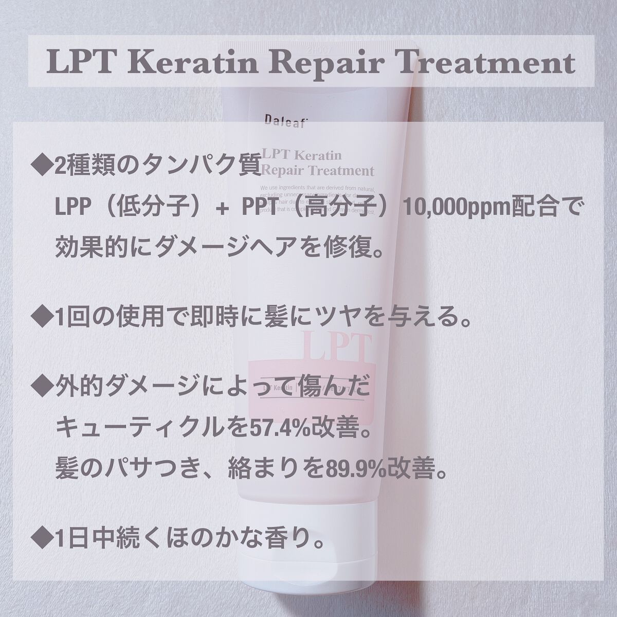 Daleaf様より提供いただきました。LPTケラチンリペアトリートメント髪が絡まる、ダメージヘア、まとまり感が欲しいそんな人におすすめのトリートメントです。低分子LPP+高分子PPTの2重タンパク質コーティングがダメージヘアにアプローチ。甘め...