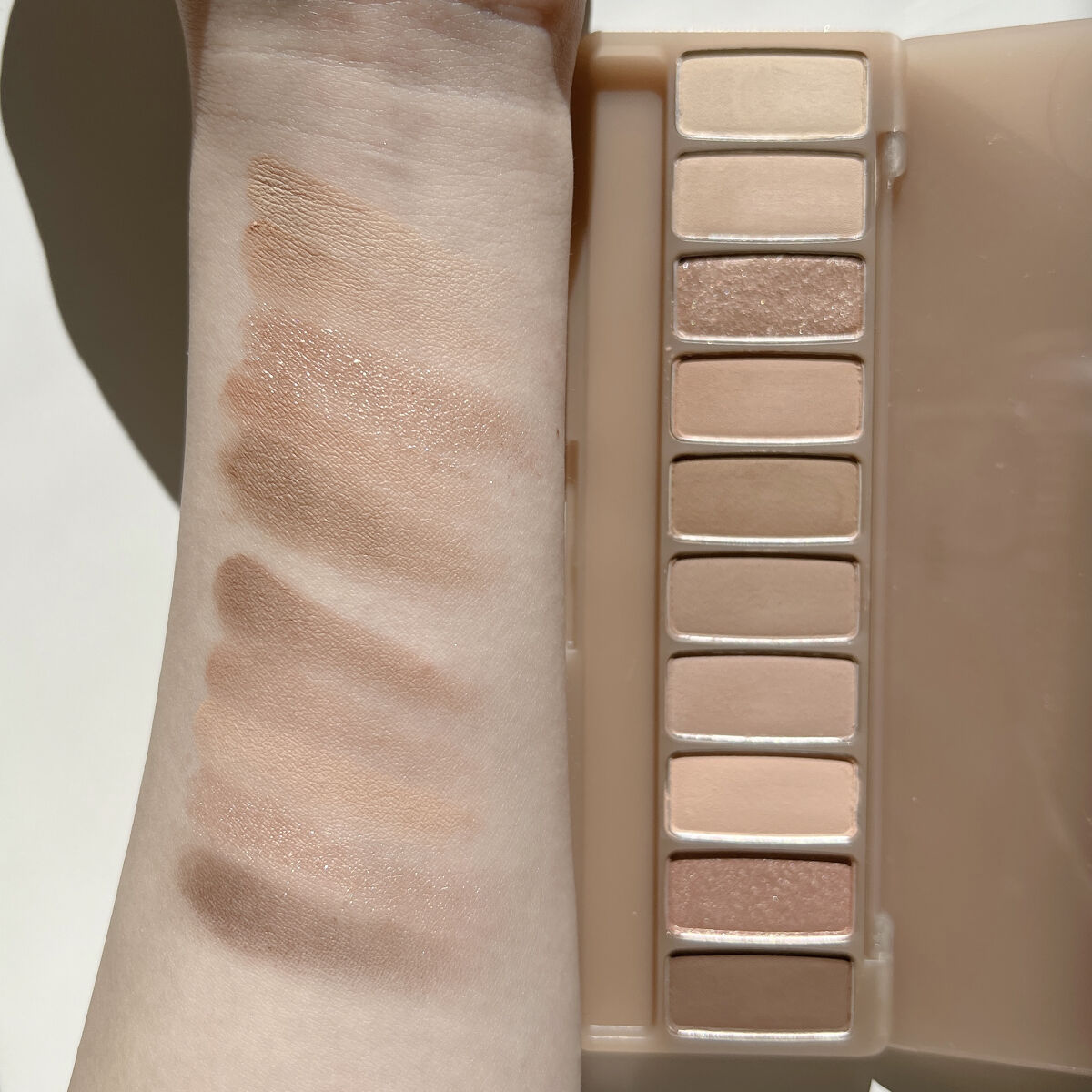 - 肌なじみの良い、鮮やかな発色で目元を華やかに彩る捨て色なしの10色アイシャドウパレット 異なる3種のテクスチャーを自由に組み合わせて、グラデーションも思いのままに。 NEW 2023.4 ・肌トーンにあう配色を詰め込んだトレンドカラー 肌トーンに合わせて、自分に似合うトレンドカラーが楽しめる♡ パーソナルカラー×トレンドカラーの掛け合わせパレットで、デイリーメイクもスペシャルメイクも気分にあわせてなりたい自分に! ・むにゅっとジェル質感ラメで高密着、煌めく目元 パレットの中でもポイントとなる大きめ粒子のラメは、ジェルのような新質感で落ちにくく肌にぴったりと密着します。キラキラとした目元をキープします。 ・使うカラーは大きめに!リアル捨て色なしパレット ベースやラメのよく使うカラーと締め色や濃い色等の減りが少ないカラーを異なるサイズで詰め込んだ、リアル捨て色なしパレット! <使用方法> 付属のデュアルシャドウブラシでベースカラーをまぶた全体に塗り広げます。細いブラシでグラデーションや目尻、アイライン、涙袋などのポイントカラーをのせて仕上げます。