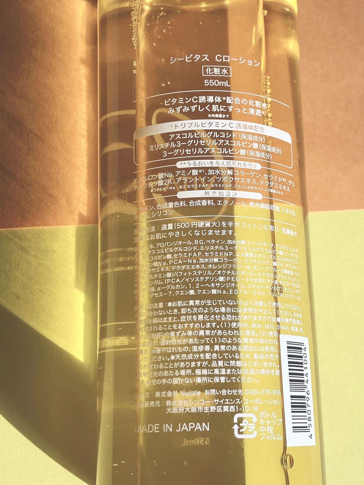 すっと浸透※3しうるおいに満ちた透明感※4のある肌に✨ 3つのビタミンC誘導体(アスコルビルグルコシド、ミスリチル3-グリセリルアスコルビン酸、3-グリセリルアスコルビン酸※全て保湿成分)配合で保湿、肌荒れ、ハリツヤケア🍊 パラベン、合成着色料、合成香料、エタノール、紫外線吸収剤、シリコンフリーで乾燥肌・敏感肌でも使いやすい✨ 柑橘系の香りで癒されながらケア出来ます! テクスチャーはほんのりとろみがありますがベタつきなく肌馴染みが良いです✨ 大容量なのでコスパ抜群!!
