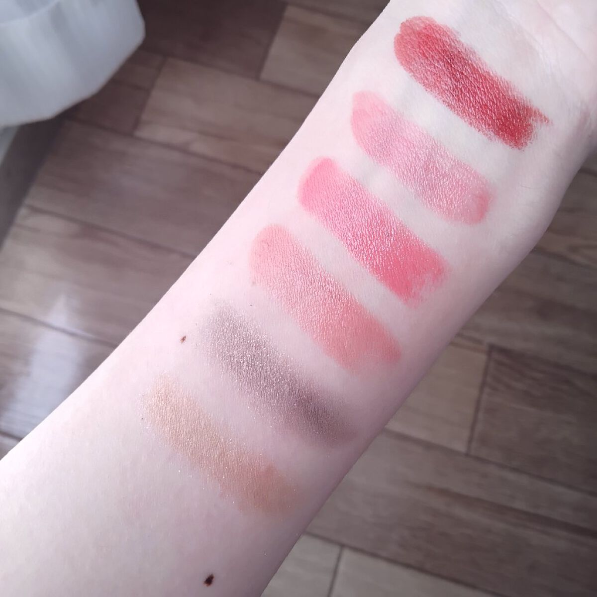 見た目はアニマルのプリントと中央のハートのデザインがとってもかわいくて、持ち手などにゴールドを使っているため、かわいいだけでなく、高級感も感じられるデザインになっています。 グロッシータイプはパステルカラーで統一されているため、並べるととてもかわいいです🎀 塗り心地が非常に軽く、スルスル塗れます。スルスル塗れるので、たっぷりしっかり塗るきれいに色が出て、ツヤも出るのでおすすめです♪ ピンク系が3つ、レッド系が1つ、ブラウン系が2つですが、いずれもツヤタイプ向きのマイルドなカラーなので使いやすいと思います。 潤いがあり、ツヤが出るので春夏にも向くし、赤みやくすみがあるので秋冬にも使えるし、万能なリップだと思います☆