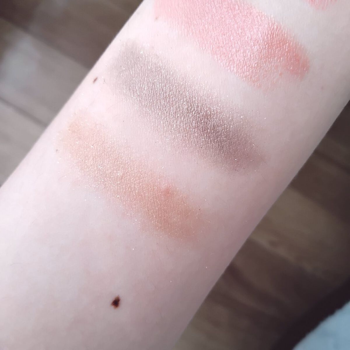 通常タイプは、しっとりした感じでつきます。 パールタイプはパールがキラキラ反射し、肌にツヤ感がでます。 今回追加されたアプリコットシェルですが、新色はほわっと発色の優しい色味で、とっても使いやすいカラーだと思います!