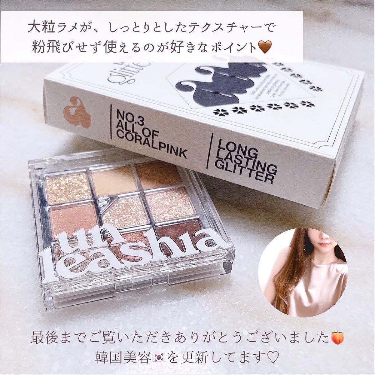 このアイシャドウめちゃくちゃ可愛いし大好きなんだけど😍 明るめコーラルのアイシャドウでラメは繊細なものからザクザクのグリッターまで。 粉質もいいから粉飛びも気にならない! ラメ落ちもしにくいしすごい綺麗なの🐰 他にもたくさんギフトでいただいたんだけど好きすぎて今回はこのアイシャドウのみレビュー🩷 グリッターペディアアイパレットは全部で7色もあって めちゃくちゃ選びたい放題👍🏻 ̖́-