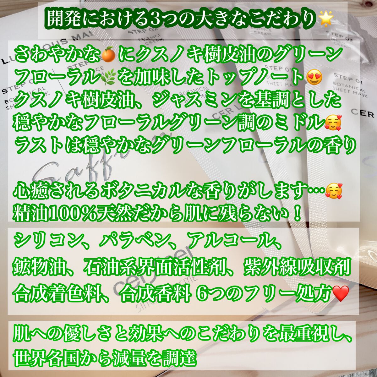 - Cer ルミナスマスク S 水、BG、グリセリン、1,2-ヘキサンジオール、ヒアルロン酸Na、サフランエキス、ナツメ果実エキス、クコ果実エキス、セイヨウサンザシ果実エキス、イチジク果実エキス、テンニンカ果実エキス、ザクロエキス、オタネニンジン根エキス、ムラサキ根エキス、トウキ根エキス、オウゴン根エキス、ハトムギ種子エキス、アロエベラ葉エキス、グルタチオン、ナイアシンアミド、アスコルビルリン酸Na、酢酸トコフェロール、ピリドキシンHCl、パントテン酸Ca、パンテノール、ビオチン、ベタイン、プロパンジオール、PCA-Na、オクテニルコハク酸デンプンNa、マルトデキストリン、シリカ、カプリリルグリコール、キサンタンガム、カルボマー、アルギニン、ポリソルベート80、EDTA-2Na、クスノキ樹皮油、オレンジ果皮油、ジャスミン油 Cer ルミナスクリーム S 水、アロエベラ葉エキス、トリ(カプリル酸/カプリン酸)グリセリル、ペンチレングリコール、BG、スクワレン、ポリソルベート80、ヒアルロン酸Na、サフランエキス、ナツメ果実エキス、クコ果実エキス、サンザシエキス、テンニンカ果実エキス、オタネニンジン根エキス、トウキ根エキス、ハトムギ種子エキス、リンゴ果実エキス、キュウリエキス、ホホバ種子油、アーモンド油、チャ種子油、1,2-ヘキサンジオール、ベタイン、アラントイン、アデノシン、パンテノール、酢酸トコフェロール、パルミトイルペンタペプチド-4、(C13,14)イソパラフィン、トリステアリン酸ソルビタン、ポリアクリル酸Na、カプリル酸グリセリル、ジメチコン、ラウレス-7、セテアリルアルコール、EDTA-2Na、クスノキ樹皮油、オレンジ果皮油、ジャスミン油