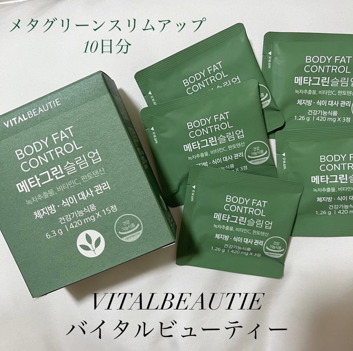 ✿バイタルビューティー✿メタグリーンスリムアップ30日分オリーブヤング健康機能食品1位*を獲得した脂肪燃焼サプリ💊体脂肪の減少を手伝ってくれる緑茶カテキンが高配合されていて、食事後の脂肪の吸収を抑えて排出を手伝ってくれる商品✨️食後に1日2粒...