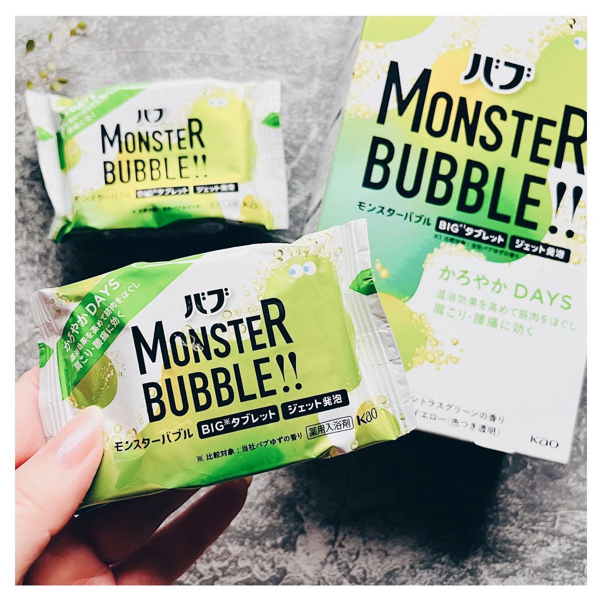 温浴効果を高めて筋肉をほぐし 肩こり・腰痛に効く かろやかDAYS 気分かろやかシトラスグリーンの香り。 シトラスグリーンの爽やかな香りもとても良かったです。全体的な使用感から、「かろやかDAYS」というネーミングは本当にこの商品にピッタリだなと思いました💗 990円で6錠入りなので、同じ値段で4個入りのモンスターバブルMEGA級と比較すると少しお安め。