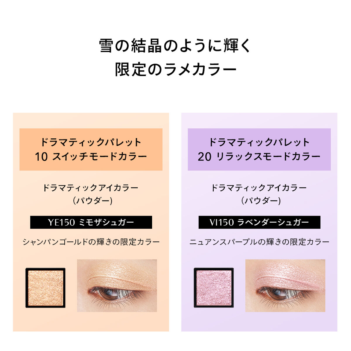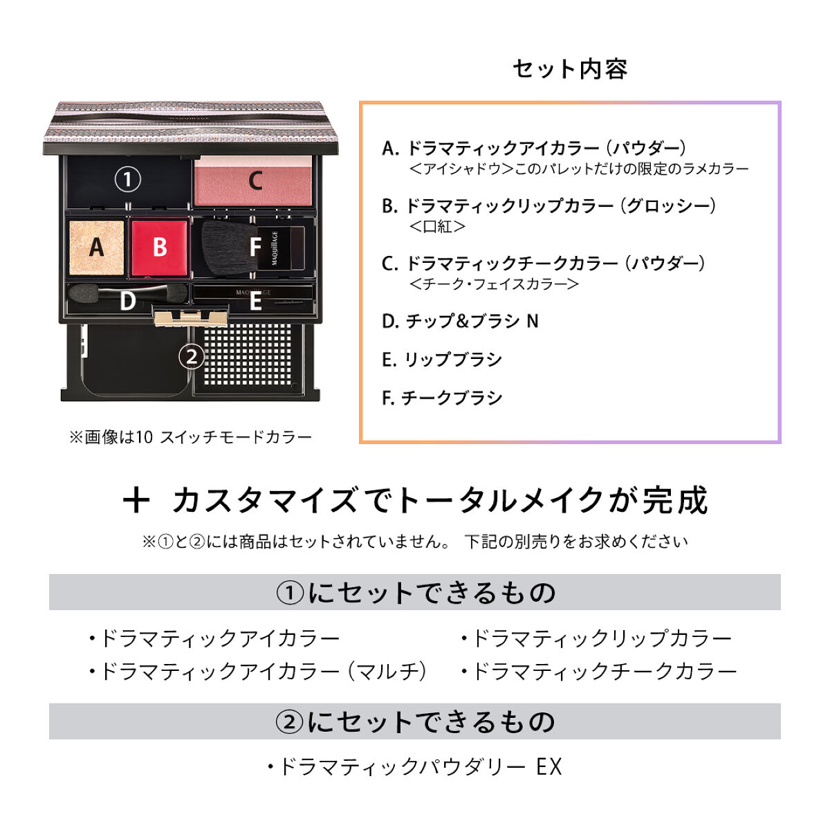 - おすすめカラーと好きな色の組み合わせでさりげない色っぽさが叶う今だけ限定の特製パレット ○感謝の気持ちを込めたギフト感のあるパッケージデザインです。 ○シーンに合わせて選べる2 種のパレット ①オトナの上質な華やかメイクが叶うスイッチモードカラー ②オトナのキレイめカジュアルメイクが叶うリラックスモードカラー ○メイクイメージに合わせた「ドラマティックリップ」、「ドラマティックチーク」(ともに、2022 年3 月21 日発売)とこのパレットだけの「ドラマティックアイカラー」限定色のセットです。 ○専用の「チークブラシ」、「リップブラシ」、「チップ&ブラシ N」内蔵 <セット内容> 10 スイッチモードカラー ・マキアージュ ドラマティックアイカラー (パウダー) YE150 ミモザシュガー(限定カラー) ・マキアージュ ドラマティックリップカラー (グロッシー) RD432 ストロベリージュレ 20 リラックスモードカラー ・マキアージュ ドラマティックアイカラー (パウダー) VI150 ラベンダーシュガー(限定カラー) ・マキアージュ ドラマティックリップカラー (グロッシー) PK431 チェリージュレ
