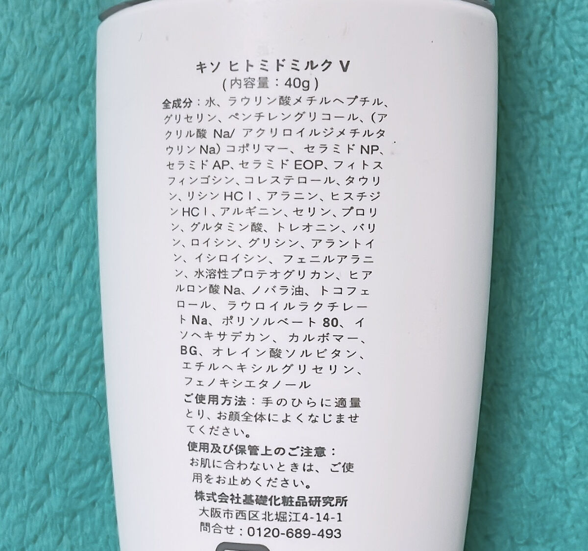 - 水、ラウリン酸メチルヘプチル、グリセリン、ペンチレングリコール、(アクリル酸Na/アクリロイルジメチルタウリンNa)コポリマー、セラミドNP、セラミドAP、セラミドEOP、フィトスフィンゴシン、コレステロール、タウリン、リシンHCI、アラニン、ヒスチジンHCI、アルギニン、セリン、プロリン、グルタミン酸、トレオニン、バリン、ロイシン、グリシン、アラントイン、イソロイシン、フェニルアラニン、水溶性プロテオグリカン、ヒアルロン酸Na、ノバラ油、トコフェロール、ラウロイルラクチレートNa、ポリソルベート-80、イソヘキサデカン、カルボマー、キサンタンガム、BG、オレイン酸ソルビタン、エチルヘキシルグリセリン、フェノキシエタノール