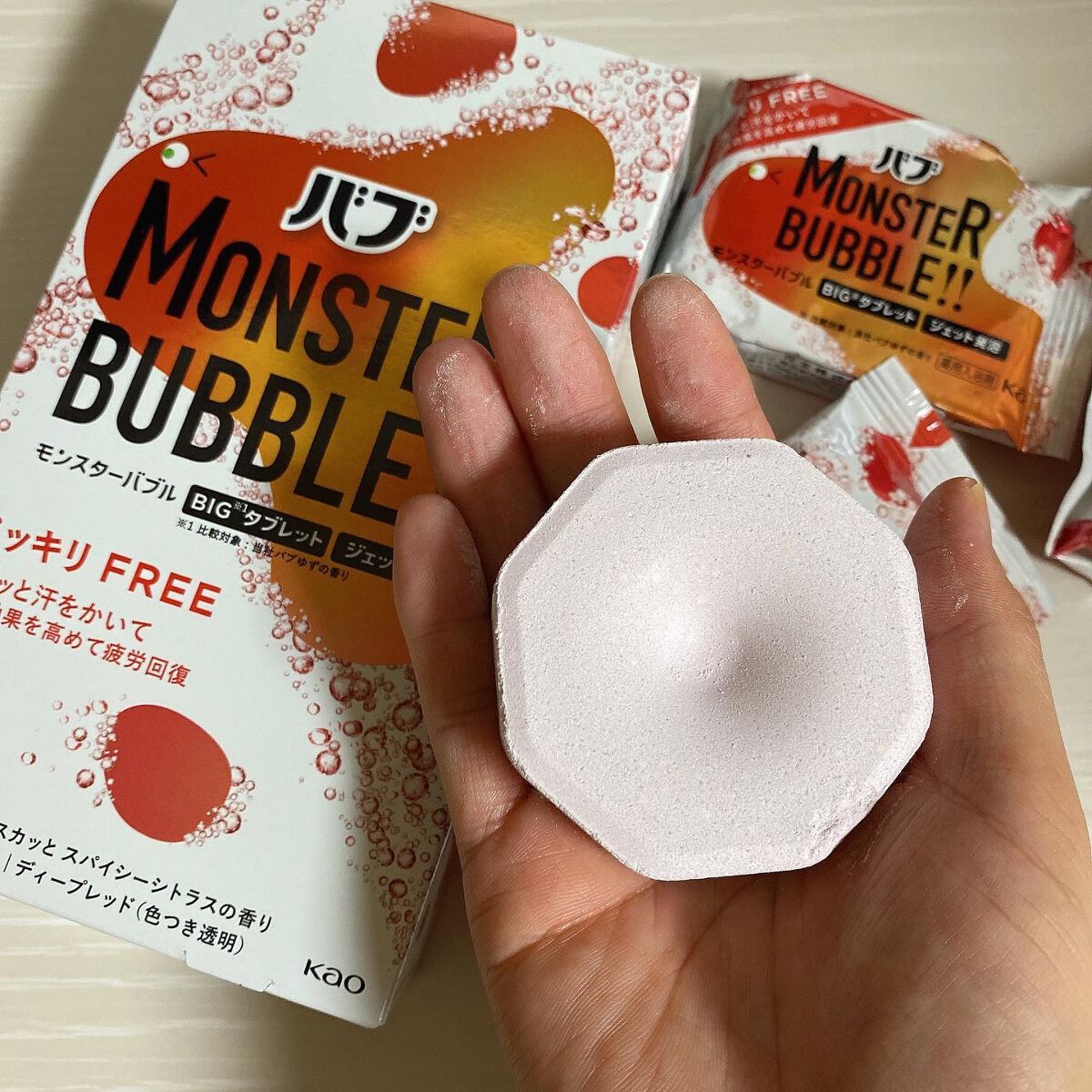 花王さまからいただきましたバブモンスターバブル スッキリFREE袋から取り出すとドーンとBIGなタブレット💥強炭酸で、しゅわしゅわと溶けていく様子を眺めるのもリフレッシュタイムになり、癒されます😌♨️素敵なディープレッドの色のお湯とスパイシー...