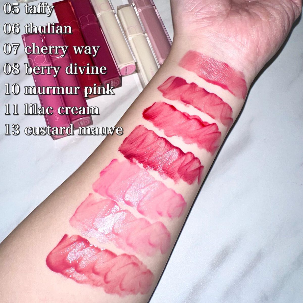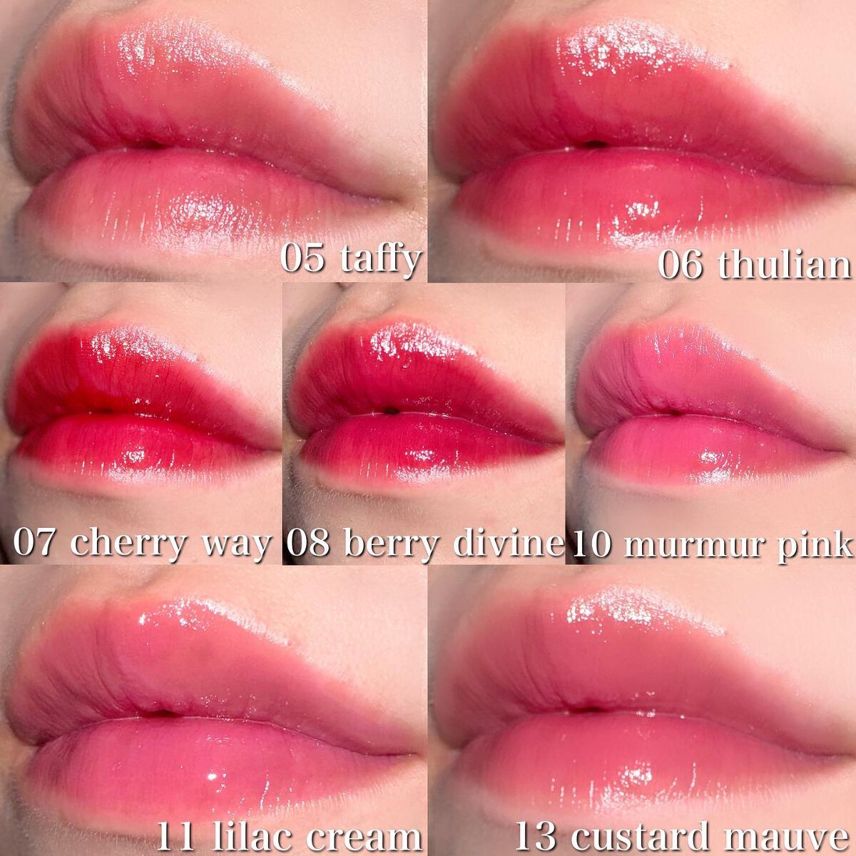 - <01 インコーラル> 水、ビスジグリセリルポリアシルアジペート-2、グリセリン、ジフェニルジメチコン、ジフェニルシロキシフェニルトリメチコン、ポリグリセリン-3、リンゴ酸ジイソステアリル、水添ポリイソブテン、ポリブテン、トリメチルシロキシフェニルジメチコン、変性アルコール、ポリソルベート60、イソノナン酸イソノニル、ペンチレングリコール、(アクリル酸ヒドロキシエチル/アクリロイルジメチルタウリンNa)コポ リマー、ラベンダーエキス、ハナハッカ花/葉/茎エキス、ローズマリーエキス、タイムエキス、ステアリン酸グリセリル、ステアリン酸PEG-100、スクワラン、ラウリルPEG-10トリス(トリメチルシロキシ)シリルエチルジメチコン、エチルヘキシルグリセリン、デキストリン、ステビオシド、イソステアリン酸ソルビタン、エチレンジアミンジコハク酸3Na、水酸化Al、ポリアクリル酸アンモニウム、BG、トコフェロール、フェノキシエタノール、香料、リモネン、酸化チタン、黄5、赤227、黄4、青1 <03 イフローズ> 水、ビスジグリセリルポリアシルアジペート-2、グリセリン、ジフェニルジメチコン、ジフェニルシロキシフェニルトリメチコン、ポリグリセリン-3、リンゴ酸ジイソステアリル、水添ポリイソブテン、ポリブテン、トリメチルシロキシフェニルジメチコン、変性アルコール、ポリソルベート60、イソノナン酸イソノニル、ペンチレングリコール、(アクリル酸ヒドロキシエチル/アクリロイルジメチルタウリンNa)コポリマー、ラベンダーエキス、ハナハッカ花/葉/茎エキス、ローズマリーエキス、タイムエキス、ステアリン酸グリセリル、ステアリン酸PEG-100、スクワラン、ラウリルPEG-10トリス(トリメチルシロキシ)シリルエチルジメチコン、エチルヘキシルグリセリン、デキストリン、ステビオシド、トリイソステアリン酸ポリグリセリル-2、イソステアリン酸ソルビタン、エチレンジアミンジコハク酸3Na、水酸化Al、ポリアクリル酸アンモニウム、BG、トコフェロール、フェノキシエタノール、香料、リモネン、酸化チタン、黄5、赤227、青1、黄4、赤218 <04 チリアップ> 水、ビスジグリセリルポリアシルアジペート-2、グリセリン、ジフェニルジメチコン、ジフェニルシロキシフェニルトリメチコン、ポリグリセリン-3、リンゴ酸ジイソステアリル、水添ポリイソブテン、ポリブテン、トリメチルシロキシフェニルジメチコン、変性アルコール、ポリソルベート60、イソノナン酸イソノニル、ペンチレングリコール、(アクリル酸ヒドロキシエチル/アクリロイルジメチルタウリンNa)コポ リマー、ラベンダーエキス、ハナハッカ花/葉/茎エキス、ローズマリーエキス、タイムエキス、ステアリン酸グリセリル、ステアリン酸PEG-100、スクワラン、ラウリルPEG-10トリス(トリメチルシロキシ)シリルエチルジメチコン、エチルヘキシルグリセリン、デキストリン、ステビオシド、イソステアリン酸ソルビタン、エチレンジアミンジコハク酸3Na、トコフェロール、BG、フェノキシエタノール、料、リモネン、黄5、赤227、黄4、青1 <06 チュリアン> 水、ビスジグリセリルポリアシルアジペート-2、グリセリン、ジフェニルジメチコン、ジフェニルシロキシフェニルトリメチコン、ポリグリセリン-3、リンゴ酸ジイソステアリル、水添ポリイソブテン、ポリブテン、トリメチルシロキシフェニルジメチコン、変性アルコール、ポリソルベート60、イソノナン酸イソノニル、ペンチレングリコール、(アクリル酸ヒドロキシエチル/アクリロイルジメチルタウリンNa)コポリマー、ラベンダーエキス、ハナハッカ花/葉/茎エキス、ローズマリーエキス、タイムエキス、ステアリン酸グリセリル、ステアリン酸PEG-100、スクワラン、ラウリルPEG-10トリス(トリメチルシロキシ)シリルエチルジメチコン、エチルヘキシルグリセリン、デキストリン、ステビオシド、イソステアリン酸ソルビタン、エチレンジアミンジコハク酸3Na、水酸化Al、ポリアクリル酸アンモニウム、BG、トコフェロール、フェノキシエタノール、香料、リモネン、酸化チタン、黄5、赤227、酸化鉄、黄4、赤218、青1 <08 ベリーディヴァイン> 水、ビスジグリセリルポリアシルアジペート-2、グリセリン、ジフェニルジメチコン、ジフェニルシロキシフェニルトリメチコン、ポリグリセリン-3、リンゴ酸ジイソステアリル、水添ポリイソブテン、ポリブテン、トリメチルシロキシフェニルジメチコン、変性アルコール、ポリソルベート60、イソノナン酸イソノニル、ペンチレングリコール、(アクリル酸ヒドロキシエチル/アクリロイルジメチルタウリンNa)コポリマー、ラベンダーエキス、ハナハッカ花/葉/茎エキス、ローズマリーエキス、タイムエキス、ステアリン酸グリセリル、ステアリン酸PEG-100、スクワラン、ラウリルPEG-10トリス(トリメチルシロキシ)シリルエチルジメチコン、エチルヘキシルグリセリン、イソステアリン酸ソルビタン、デキストリン、ステビオシド、エチレンジアミン