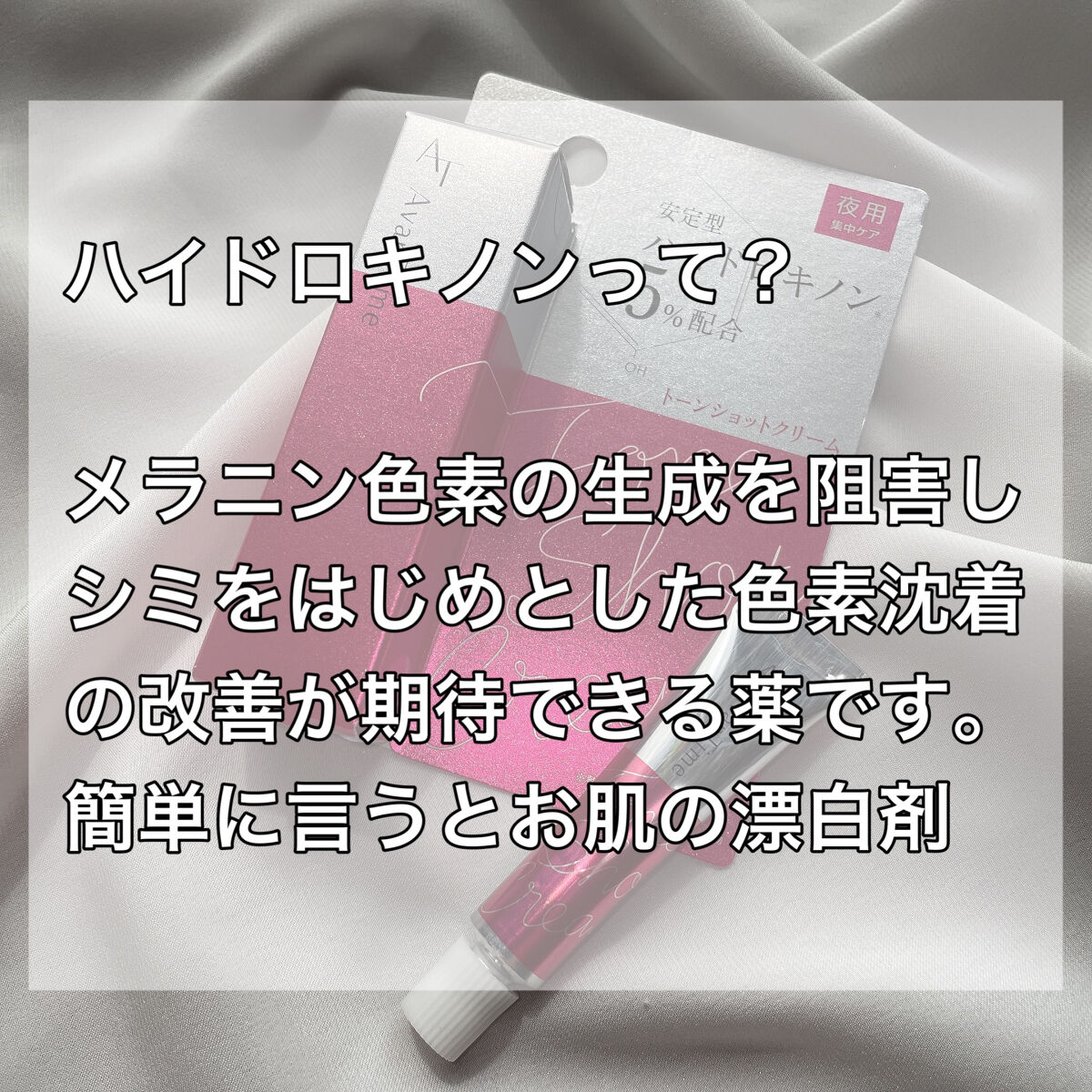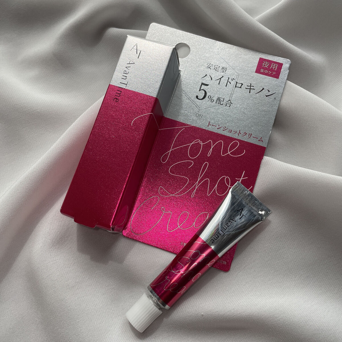 - 「アバンタイム トーンショットクリーム」は安定型ハイドロキノン SHQ-1を5%配合したクリームです。成分が徐々に溶け出しターゲットエリアにアプローチする製品設計であるため、肌にやさしく持続的な作用が期待できます。滑らかで密着しやすいクリームタイプなので、気になる部分を集中的にピンポイントケアすることが可能です。夜のスキンケアの最後に、お肌の気になるポイントにご使用ください。