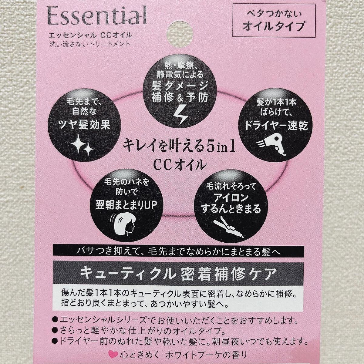 - パサついてからまる髪に。 キレイを叶える5in1ヘアオイル(髪ダメージ補修&予防・ツヤ髪効果・ドライヤー速乾・翌朝まとまりUP・アイロンするんときまる)。 「キューティクル密着補修ケア」傷んだ髪1本1本のキューティクル表面に密着し、なめらかに補修。 指どおり良くまとまって、あつかいやすい髪へ。 ●パサつき抑えて、毛先までなめらかにまとまる。 ●オイルなのにベタつかない ●華やかで心地よい フローラルブーケの香り 【洗い流さないトリートメント】