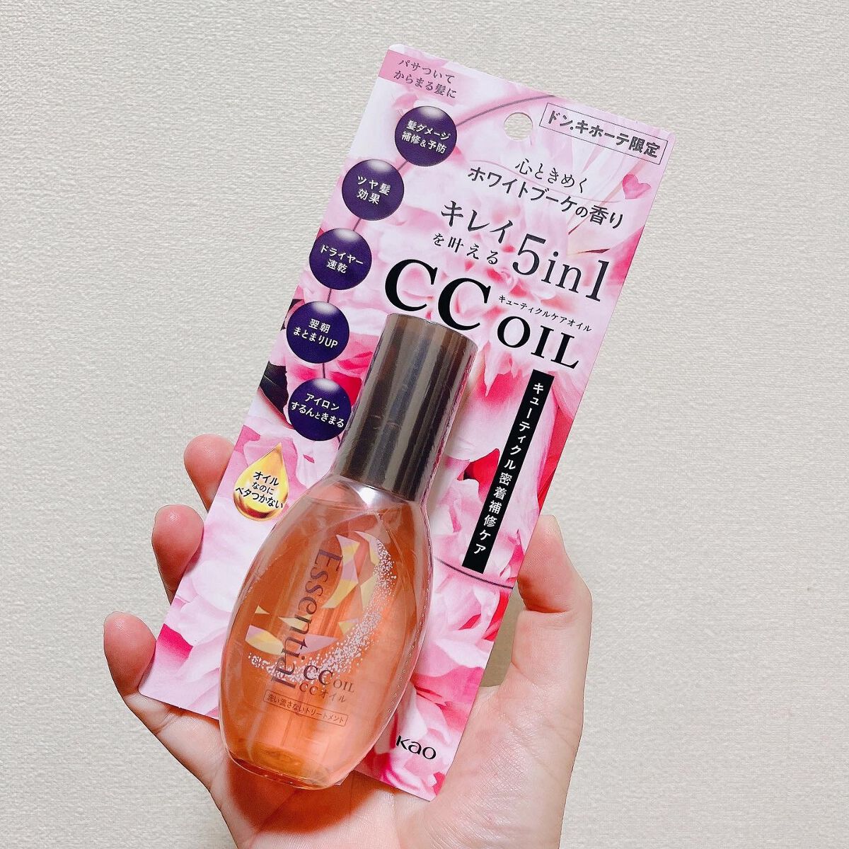 エッセンシャル CCオイル 心ときめくホワイトブーケの香り ほんのり甘酸っぱさがあって、心がきめいちゃうような香りです♡♡ オイルは重くなく、べとつきにくくさらさらとした仕上がりです◎ さらさら髪&ときめく香りでモテちゃうかも(灬ºωº灬)♡ 数量限定なので、お近くのドンキへ急げー!!