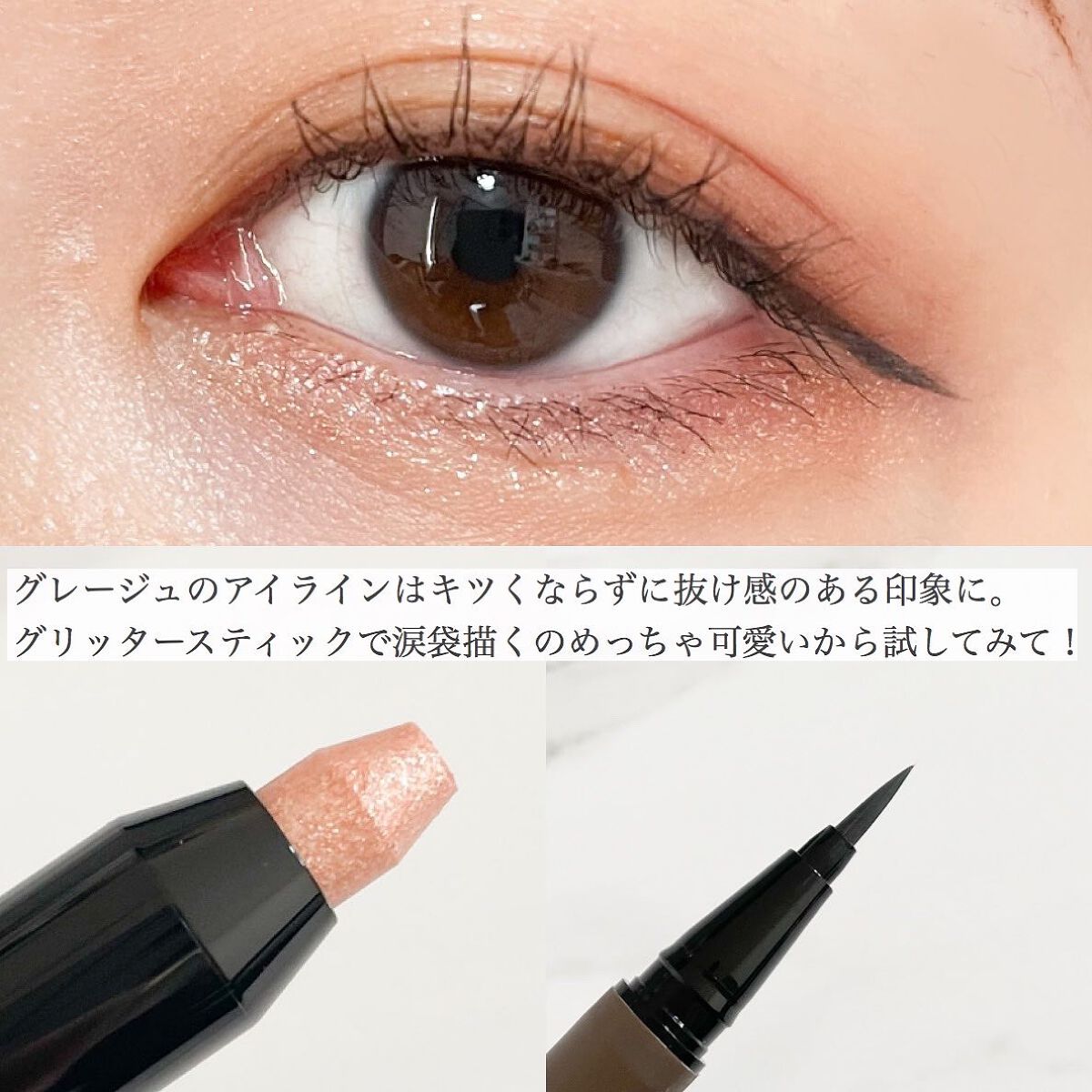 涙袋、アイシャドウ、ハイライトとして使えるアイテム! するするなめらかに使えて高密着💫ラメ飛びしにくいです! マット仕上げのリキッドアイライナー! 変にテカったりする感じなく肌馴染みがいい。 細いラインも描きやすく絶妙なグレージュカラーが使いやすいよ🤍