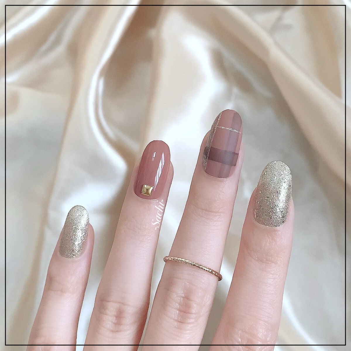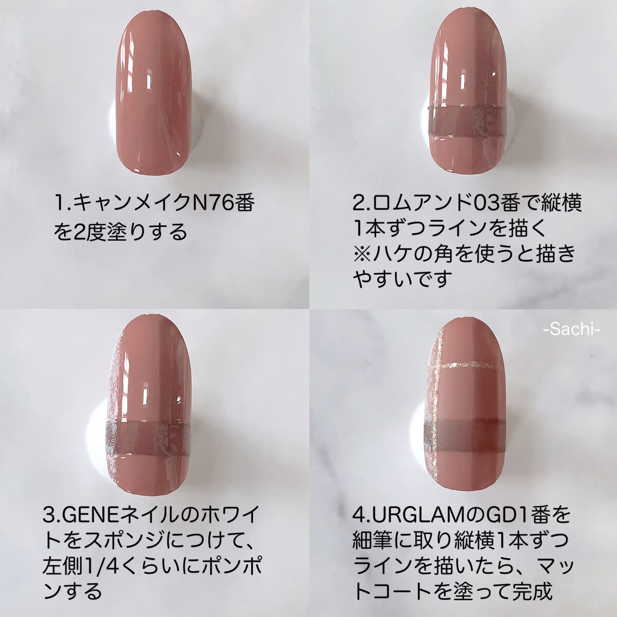 ワンカラーでも指ごとに色を変えるだけでオシャレに見えます💕 画像のようにゴールドラインとストーンを少し足すだけで華やかさがアップ🥰 何度かご紹介したことのあるスポンジで作るグラデーションです✨ スポンジを使うことで境目が綺麗に馴染んでくれます💕 アルミホイルの上でブラウンとトップコートを1:1くらいで混ぜたものを、トップコートのハケに取って3箇所に塗るだけ👌 事前に混ぜたものを塗ることで、爪の上でぼかすより簡単に出来ます💕 ベースカラーが乾く前に点置きしてぼかすことで綺麗にぼかせます✨ スピードが大事なので、使うポリッシュのキャップは全て開けておきましょう😊 天然石のラインはガタガタの方がより天然石っぽく見えるので、ラインを描くのが苦手な方でも大丈夫🙆♀️ 難しそうに見えて、やってみると意外と簡単に出来ます♡