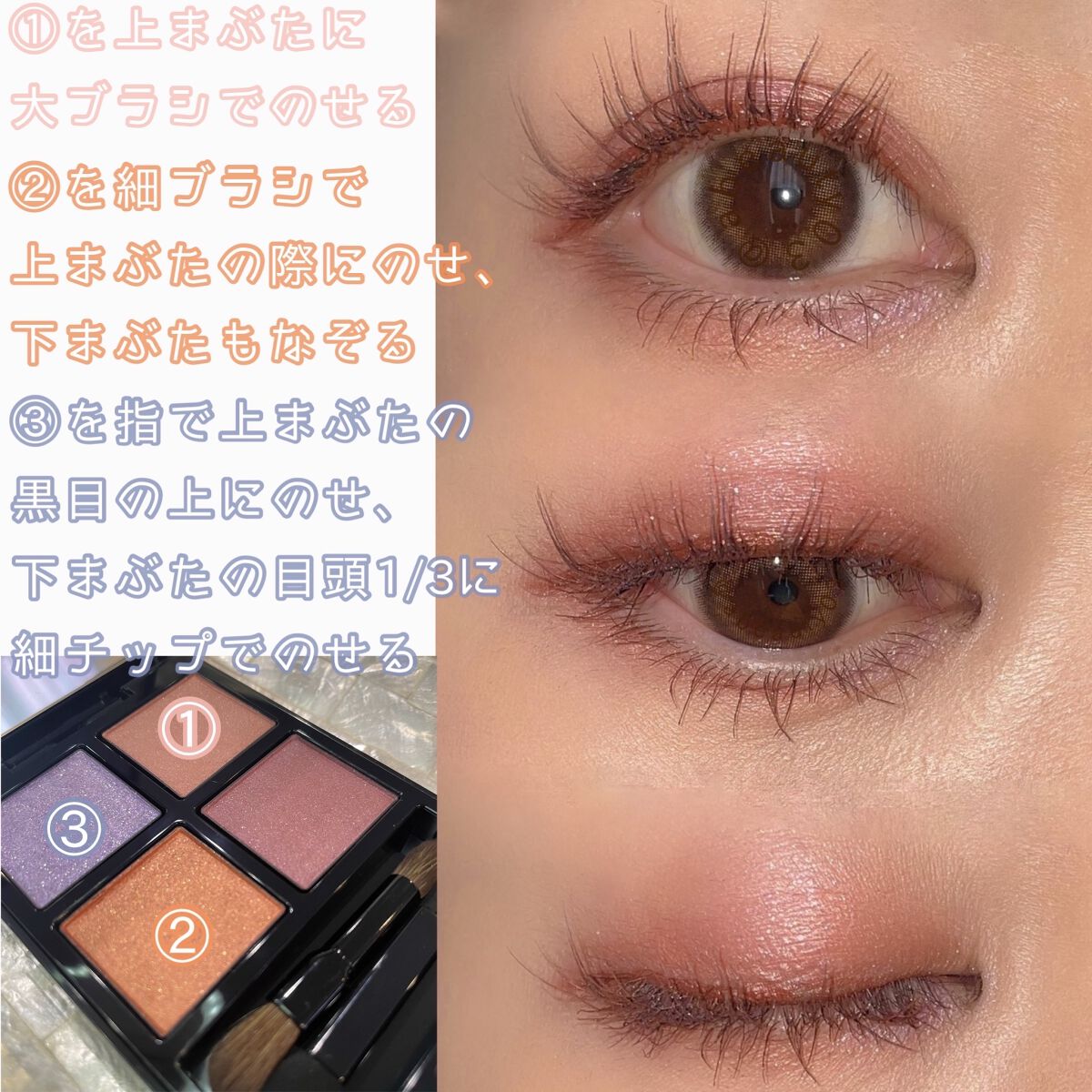 ジューシー発色なパレットです✨ この左上のスパークルがこのパレットを「無難」ではない 「ちょっと攻めた」夏のかわいさ(語彙力…)のある パレットにしてくれてる気がします🤭✨ ソフトな発色のベージュピンク シアーなコーラルオレンジ(サーモンピンク、というよりコーラルオレンジ、という印象🤔) 偏光カラーのパール入り 目元にのせてみるとパレットで見た印象より 青み感がなく、イエベの私も使いやすい印象でした。 このカラーを使うと一気に深みが。 使わなければ全体的にコーラルオレンジ感が出て、 よりジューシーで夏らしい感じに✨