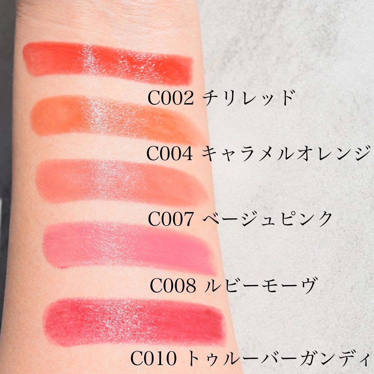 - <C001 > リンゴ酸ジイソステアリル、トリ(カプリル/カプリン酸)グリセリル、エチルヘキサン酸セテアリル、合成ワックス、ダイマージリノール酸(フィトステリル/イソステアリル/セチル/ステアリル/ベヘニル)、ビスジグリセリルポリアシルアジペート-2、マイクロクリスタリンワックス、ポリイソブテン、カプリリルグリコール、酢酸トコフェロール、エチルヘキシルグリセリン、ジメチルシリル化シリカ、ホホバ種子油、アーモンド油、オリーブ果実油、マカデミア種子油、ペルシアグルミ種子油、ヘーゼルナッツ種子油、シア脂、ヤシ油.[+/-]赤201、赤202、赤218、赤223、赤226、青1、黄4、黄5、黄203、クエン酸、酸化チタン、酸化鉄、水酸化Al、トリエトキシカプリリルシラン、ポリメタクリル酸メチル <C002> リンゴ酸ジイソステアリル、トリ(カプリル/カプリン酸)グリセリル、エチルヘキサン酸セテアリル、合成ワックス、ダイマージリノール酸(フィトステリル/イソステアリル/セチル/ステアリル/ベヘニル)、ビスジグリセリルポリアシルアジペート-2、マイクロクリスタリンワックス、ポリイソブテン、カプリリルグリコール、酢酸トコフェロール、エチルヘキシルグリセリン、ジメチルシリル化シリカ、ホホバ種子油、アーモンド油、オリーブ果実油、マカデミア種子油、ペルシアグルミ種子油、ヘーゼルナッツ種子油、シア脂、ヤシ油.[+/-]赤201、赤202、赤218、赤223、赤226、青1、黄4、黄5、黄203、クエン酸、酸化チタン、酸化鉄、水酸化Al、トリエトキシカプリリルシラン、ポリメタクリル酸メチル <C003> リンゴ酸ジイソステアリル、トリ(カプリル/カプリン酸)グリセリル、エチルヘキサン酸セテアリル、合成ワックス、ダイマージリノール酸(フィトステリル/イソステアリル/セチル/ステアリル/ベヘニル)、ビスジグリセリルポリアシルアジペート-2、マイクロクリスタリンワックス、ポリイソブテン、カプリリルグリコール、酢酸トコフェロール、エチルヘキシルグリセリン、ジメチルシリル化シリカ、ホホバ種子油、アーモンド油、オリーブ果実油、マカデミア種子油、ペルシアグルミ種子油、ヘーゼルナッツ種子油、シア脂、ヤシ油.[+/-]赤201、赤202、赤218、赤223、赤226、青1、黄4、黄5、黄203、クエン酸、酸化チタン、酸化鉄、水酸化Al、トリエトキシカプリリルシラン、ポリメタクリル酸メチル <C004> リンゴ酸ジイソステアリル、トリ(カプリル/カプリン酸)グリセリル、エチルヘキサン酸セテアリル、合成ワックス、ダイマージリノール酸(フィトステリル/イソステアリル/セチル/ステアリル/ベヘニル)、ビスジグリセリルポリアシルアジペート-2、マイクロクリスタリンワックス、ポリイソブテン、カプリリルグリコール、酢酸トコフェロール、エチルヘキシルグリセリン、ジメチルシリル化シリカ、ホホバ種子油、アーモンド油、オリーブ果実油、マカデミア種子油、ペルシアグルミ種子油、ヘーゼルナッツ種子油、シア脂、ヤシ油.[+/-]赤201、赤202、赤218、赤223、赤226、青1、黄4、黄5、黄203、クエン酸、酸化チタン、酸化鉄、水酸化Al、トリエトキシカプリリルシラン、ポリメタクリル酸メチル <C005 > リンゴ酸ジイソステアリル、トリ(カプリル/カプリン酸)グリセリル、エチルヘキサン酸セテアリル、合成ワックス、ダイマージリノール酸(フィトステリル/イソステアリル/セチル/ステアリル/ベヘニル)、ビスジグリセリルポリアシルアジペート-2、マイクロクリスタリンワックス、ポリイソブテン、カプリリルグリコール、酢酸トコフェロール、エチルヘキシルグリセリン、ジメチルシリル化シリカ、ホホバ種子油、アーモンド油、オリーブ果実油、マカデミア種子油、ペルシアグルミ種子油、ヘーゼルナッツ種子油、シア脂、ヤシ油.[+/-]赤201、赤202、赤218、赤223、赤226、青1、黄4、黄5、黄203、クエン酸、酸化チタン、酸化鉄、水酸化Al、トリエトキシカプリリルシラン、ポリメタクリル酸メチル <C006> リンゴ酸ジイソステアリル、トリ(カプリル/カプリン酸)グリセリル、エチルヘキサン酸セテアリル、合成ワックス、ダイマージリノール酸(フィトステリル/イソステアリル/セチル/ステアリル/ベヘニル)、ビスジグリセリルポリアシルアジペート-2、マイクロクリスタリンワックス、ポリイソブテン、カプリリルグリコール、酢酸トコフェロール、エチルヘキシルグリセリン、ジメチルシリル化シリカ、ホホバ種子油、アーモンド油、オリーブ果実油、マカデミア種子油、ペルシアグルミ種子油、ヘーゼルナッツ種子油、シア脂、ヤシ油.[+/-]赤201、赤202、赤218、赤223、赤226、青1、黄4、黄5、黄203、クエン酸、酸化チタン、酸化鉄、水酸化Al、トリエトキシカプリリルシラン、ポリメタクリル酸メチル <C007> リンゴ酸ジイソステアリル、トリ(カプリル/カプリン酸)グリセリル、エチルヘキサン酸セテアリル、合成ワックス、ダイマージリノール酸(フィトステリル/イソステアリル/セチル/ステアリル/ベヘニル)、ビスジグリセリルポリアシルアジ