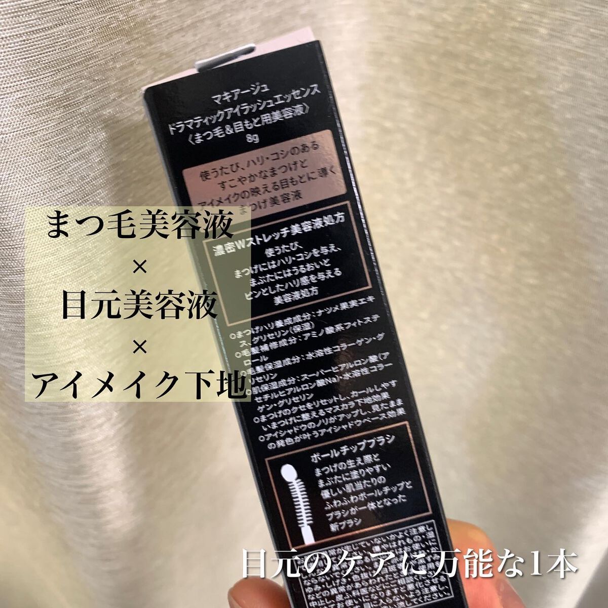- 目もとケアまでできる「まつげ美容液」 まつげの土台のまぶたまでケアすることで、使うたび、ハリ・コシのあるすこやかなまつげとアイメイクの映える目もとに。 まつげ美容液・目もと美容液・アイメイク下地の3つの機能! ○まつげ美容液:使うたび、ハリ・コシのあるまつげに導く ○目もと美容液:乾燥を防ぎ、ピンとしたハリ感を与える ○アイメイク下地:マスカラ・アイシャドウのノリがUP 【濃密Wストレッチ美容液処方】 ○まつげハリ養成成分* ○まつげを内部から補修する毛髪補修成分** ○まつげを保護・トリートメントする毛髪保湿成分*** ○目もとを乾燥から保護し、うるおいとハリ感をUPさせる肌保湿成分**** *ナツメ果実エキス、グリセリン(保湿) **アミノ酸系フィトステロール ***水溶性コラーゲン・グリセリン ****スーパーヒアルロン酸(アセチルヒアルロン酸Na)・水溶性コラーゲン・グリセリン