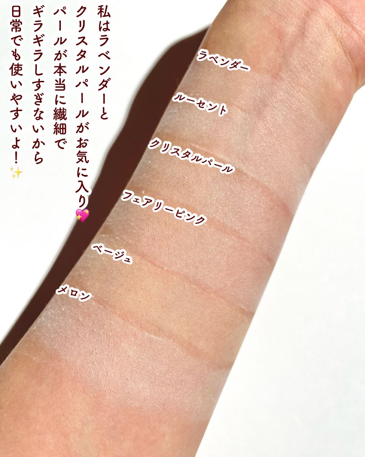 コレはモテ確定のアイシャドウと私の中で決定した 左上: 偏光パールがチラつく珍しいピンクカラー 右上:ホワイトやピンクのラメが煌めくカラー 真ん中: 柔らかいパール入りのベージュ 左下:シアーな赤。少し温かみのあるコーラル感も感じます 右下:マットカラーの赤みのあるブラウン これはね、動画でも伝わらないぐらいラメが繊細で可愛いんだよね😍 女の子らしさが溢れんばかりの儚げピンク💗