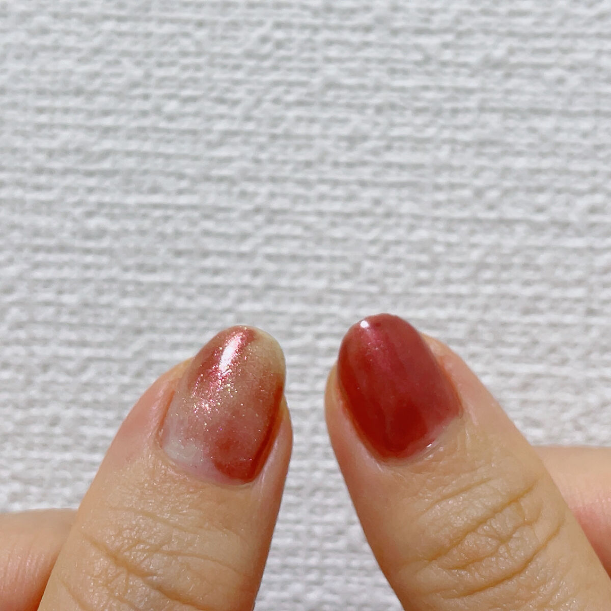 OSAJI『蜜』を2度塗り とにかく塗りやすい✨ 特に2度塗りだとムラなく綺麗に塗れます! 1度塗りの方が肌なじみは良い気がしました。 ブルベの方にも使いやすいブラウンだと思います🙌🏻 細かいラメがたくさん入っていて美しい❣️ 透明のベースにホログラムざくざく🌟 濃いめのカラーに乗せるとホロが目立ってかわいい🙆♀️ ホロが筆につきにくくてもうちょっとたくさん入ってればなぁと思ったので悩んでマイナス1。 でもかわいいので次は別の違う筆を使ってもっとぎっしり乗せてみたいと思います😙