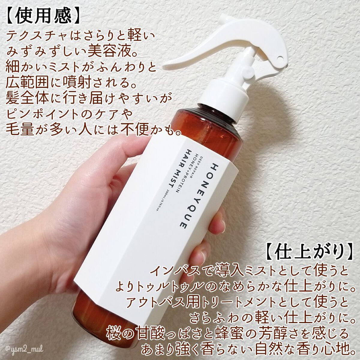 - 毛先まで素直にまとまる蜜髪へと導く「ハニープロテイン処方(保湿)」の2WAY導入保水液ヘアミスト。 髪内部の保水力をサポートするオーガニックマヌカハニー*1や、髪の芯から集中補修する3種のプロテイン*2など、髪の芯から鍛える*3成分を厳選して配合。 インバスとアウトバスの2WAYでマルチに使えます。シャンプーとトリートメントの間に使う導入液ミストとして使うことで、次に使うトリートメントの浸透をサポート。 うねり、湿気、髪の広がりが気になるときの美容液ミストとして、アウトバスケアにも使えます。アクアブロッサムハニーの香り *1 ハチミツ(保湿) *2 加水分解乳タンパク、イソステアロイル加水分解シルク、加水分解ローヤルゼリータンパク(全て保湿) *3 髪の質感が変わる、潤いによるまとまりや手触りのこと