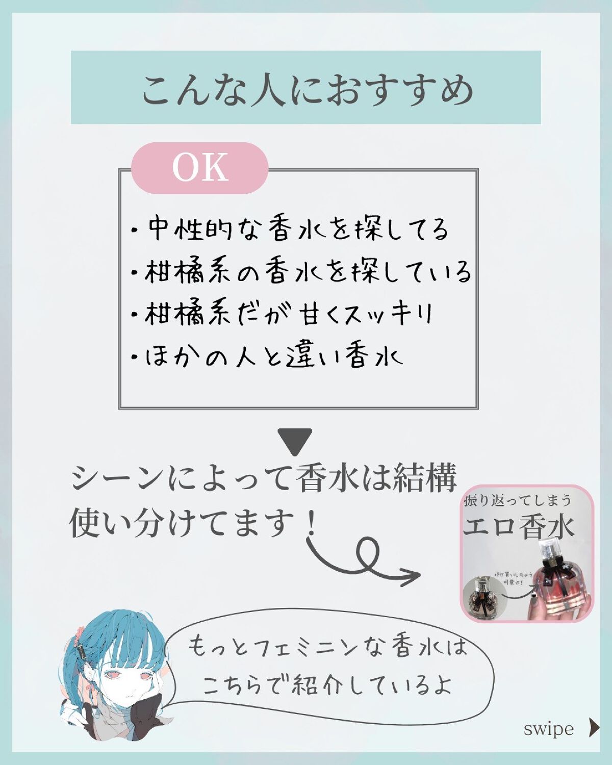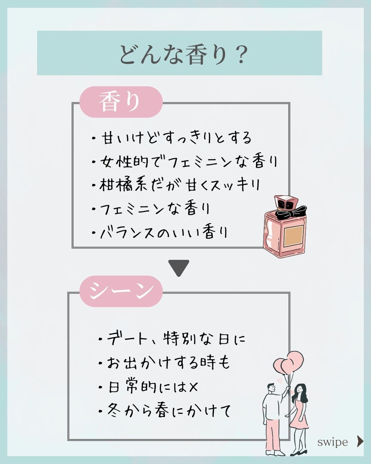 | 香水ランキング第3位 | 結構甘い香りで、The女の子って感じ♡一滴垂らすだけでかなり香るし、持ちもいい! | 詳細を見る | |
