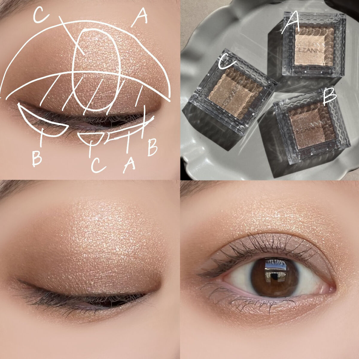 まず色の透明感に驚く! 右上のベージュは、まぶたに馴染むのに綺麗に明るく魅せるカラーでベース仕込みにぴったり✨ 左のラメ2色は言葉はいらないよね。 誰が見ても可愛いと言うだろう、ダイヤモンド並みの輝きを放つラメ✨✨ 右下のブラウンは これもかなり透明感のあるカラー! しっかりめに塗っても濃くなりすぎないカラーで 締め色が苦手な人も塗ってみて🥹 思ってた以上に可愛いアイパレで 大大大満足!!!