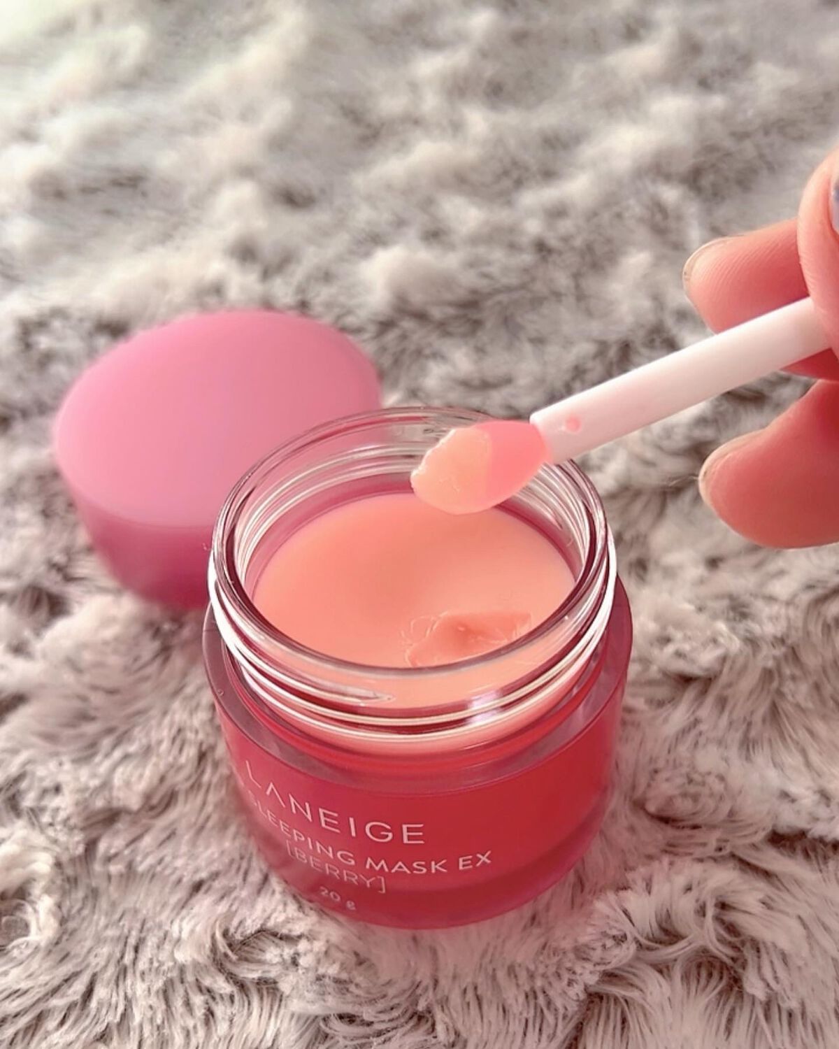 - 寝ている間にケアしてふっくらぷるぷるにうるおった唇へ。 2015年の初代発売以降、世界で2秒に1個売れている*¹LANEIGE大ヒットシリーズ *¹ 2024年グローバル販売実績 1.角質にアプローチするBerryFruitComplex (ベリーフルーツコンプレックス)*²が、 寝ている間に気になる乾燥や角質にうるおいを与え、つやのあるふっくらとうるおった唇に仕上げます。 *²ザクロ果実エキス、ブドウ果実エキス、ラズベリー果実エキス 2.ココナッツオイル(ヤシ油)を配合で、うるおいをあたえ睡眠中の乾燥を防ぎます。 3.今夜はどんな気分?5つのフレーバーから選べるワクワク感。 ■テクスチャー:やさしく馴染むなめらかなバームタイプ ■アレルギーテスト済み*³ *³全ての方にアレルギーが起こらないということではありません。 ■使用方法 寝る前に唇にたっぷり塗り、そのままお休みください。 翌朝、軽くティッシュオフします。付属のスパチュラで塗ることで、より唇の角質に馴染みやすくなります。 日中のリップトリートメントにも使用できます。