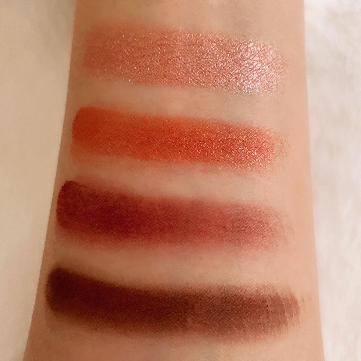 3色全てにゴールドラメが入ってて、くすみの落ち着いたカラー✨ 落ちついてるけど、上品なラメ・透明感・艶感・濡れ感が凄い😍 箔=フォイルからインスパイアされ 湿式製法を採用して、リキッド状にして固めてから圧縮し、乾燥して固めてるそうです リュクスアイシャドウとはまた違い しっとりして、柔らかい粉質ですが ピタッと密着します✨ 単品でも美しく、存在感ありますが 合わせてると更に美しい🥰 3色合わせてみたら、凄く綺麗な色になり 気に入りました💕