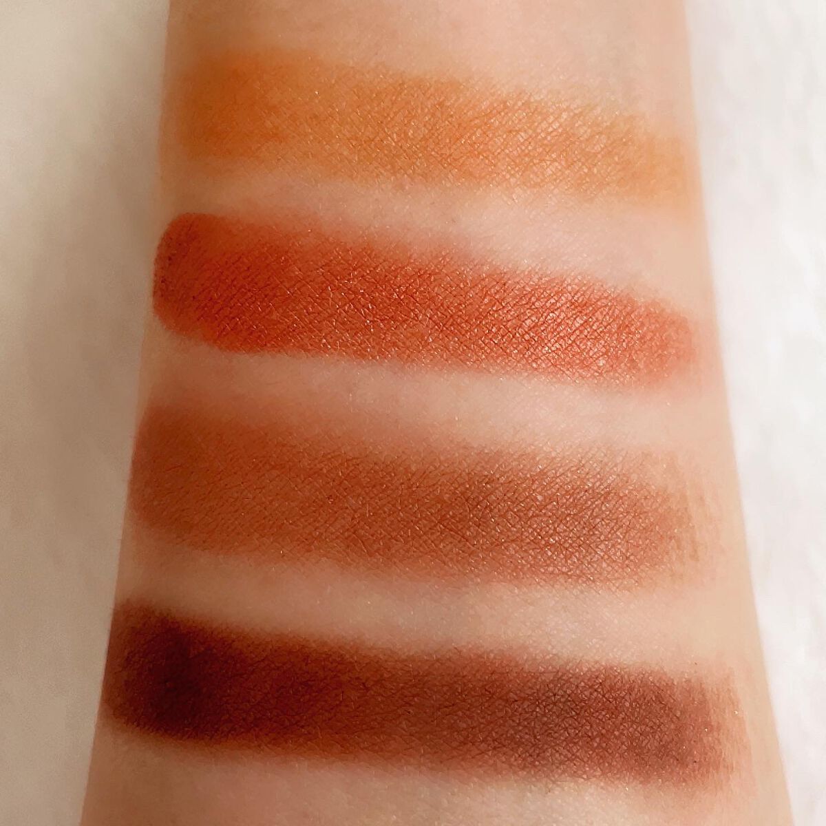 思わずパケ買い❤️ マットカラーの発色がヤバすぎます😳 高発色すぎる!! 右下のラメも発色がよく 綺麗です✨ この使い方だと、普段使い厳しいから 更に控えめにしてみようかな🤔 ブルベさんに合いそうなアイシャドウです❤️ 他にもオレンジ系とパープル系があって どれも可愛いく、発色が良いです☺️
