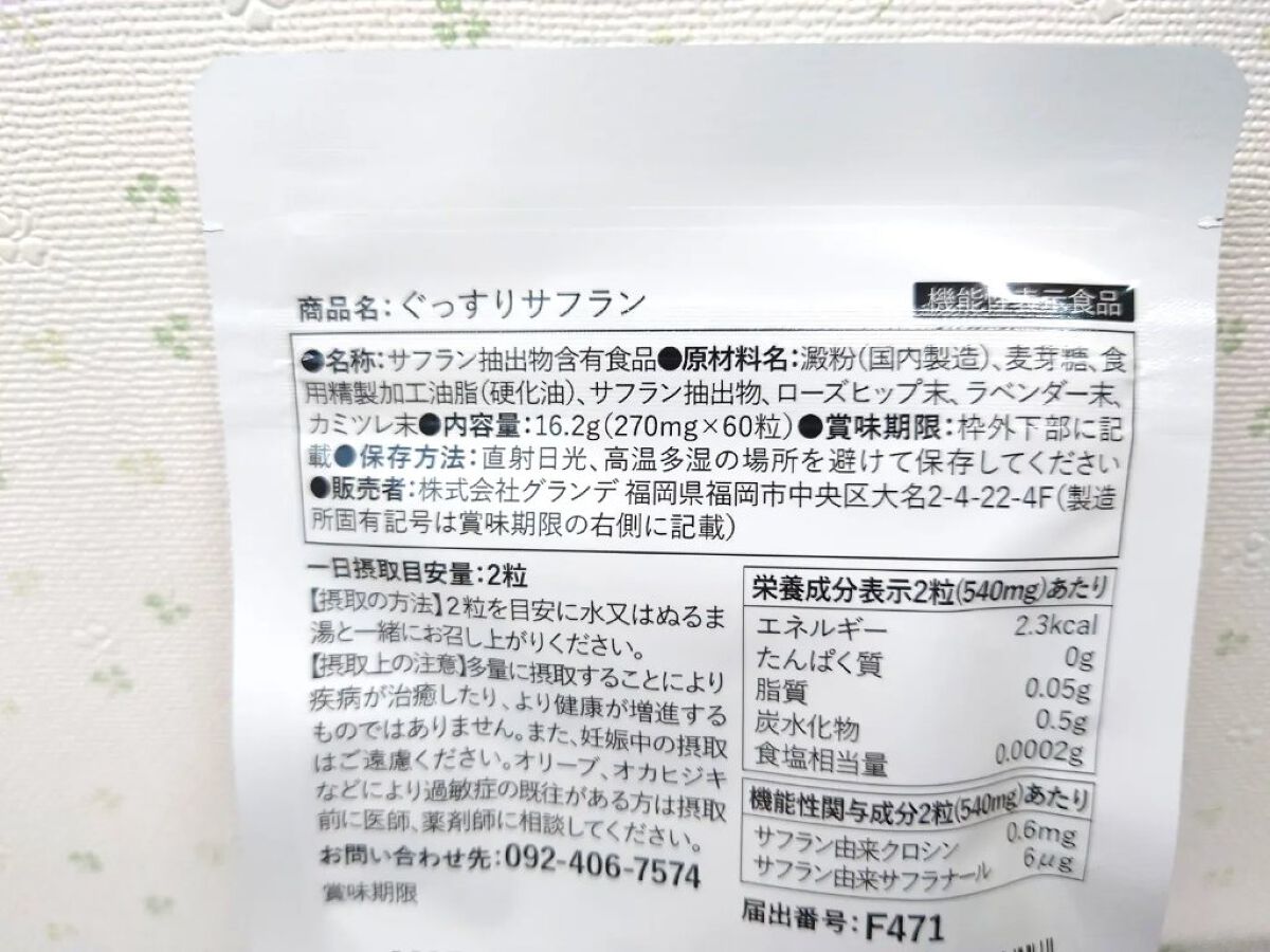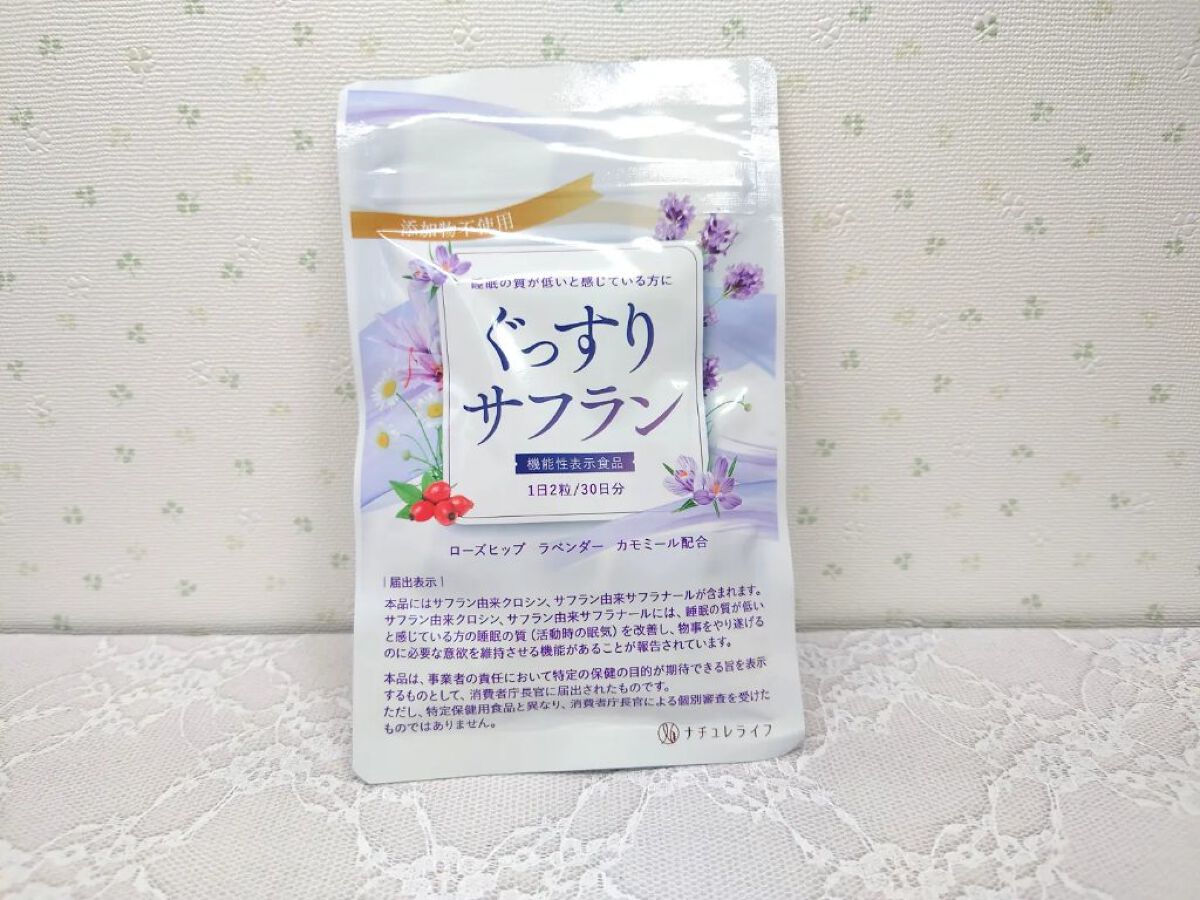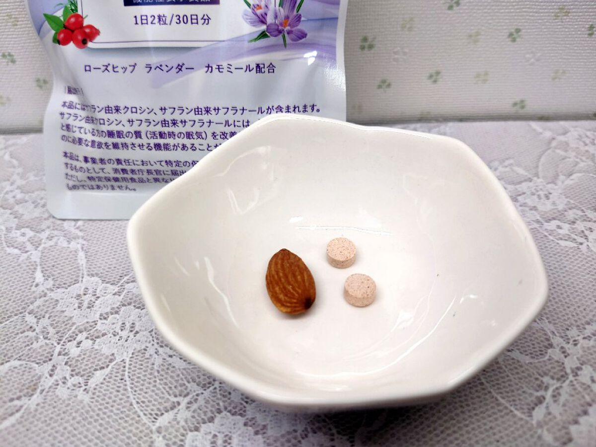 睡眠の質が低いと感じている方の睡眠の質(活動時の眠気)を改善し、物事をやり遂げるのに必要な意欲を維持させる機能が期待できるサフラン由来クロシン、サフラン由来サフラナール配合の機能性表示食品です。 さらにビタミンC豊富なローズヒップ・ハーブティやアロマでお馴染みのカモミール・おだやかな香りのラベンダーを配合。 パウチタイプの商品で上品なデザインだなと思います。 封を開けるとピンク色っぽい錠剤タイプで、ふんわりと良い香りがします🎶 飲んでみても味はほとんど感じず1回量が2粒なのでスルンと飲み込め喉にひっかかる感じもありません😍 こちらを飲んでいると何となく朝スッキリと起きれる気がしますし何となく眠りが深くなったかな❓️と感じることができています✨ 飲んでいて安心できるのも嬉しいポイントだなと思います😊