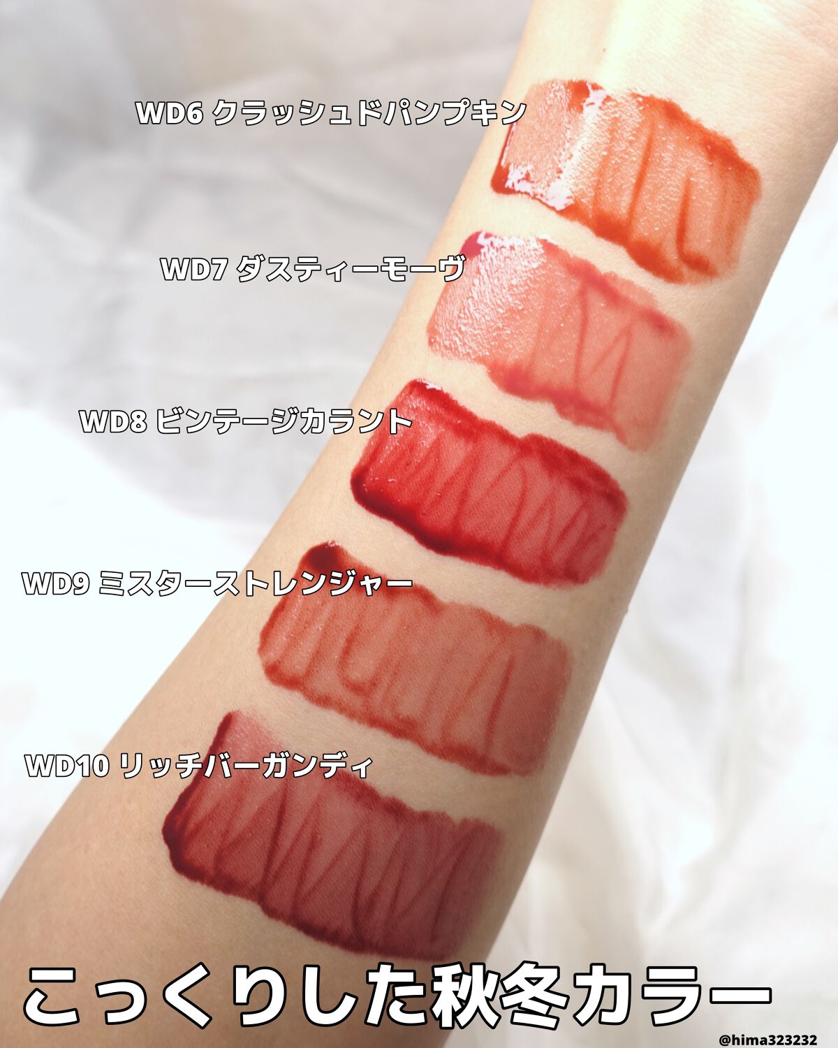 ウルウルちゅるんな仕上がりのティント❤︎ 軽いウォーターベースのグロステクスチャーだからベタっとすることもなく、塗ったときの発色が長続き❤︎ ティッシュオフしてもご覧の通りしっかり色が残っております🫡 クリアなパケもかわいいし、ベリーっぽい甘い香りも好み😍♥️ 私はWD.7 ダスティモヴがお気に入り❤︎ 可愛さも兼ね備えたくすみローズカラーがツボ🌹
