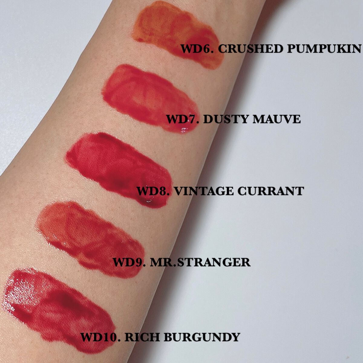 - <WD2 ビトゥン ローズ> 水、ジフェニルジメチコン、リンゴ酸ジイソステアリル、ビスジグリセリルポリアシルアジペート-2、水添ポリイソブテン、ジグリセリン、DPG、セチルPEG/PPG-10/1ジメチコン、イソステアリン酸ソルビタン、ポリソルベート60、ペンチレングリコール、オクチルドデカノール、セテアレス-20、(アクリル酸ヒドロキシエチル/アクリロイルジメチルタウリンNa)コポリマー、スクワラン、フェノキシエタノール、ポリグリセリン-3、ステビオシド、香料、エチルヘキシルグリセリン、グリセリン、シア脂、ツバキ種子油、トリ(カプリル酸/カプリン酸)グリセリル、アルガニアスピノサ核油、ホホバ種子油、アーモンド油、アンズ核油、月見草油、オリーブ果実油、テトラ(ジ-t-ブチルヒドロキシヒドロケイヒ酸)ペンタエリスリチル、カニナバラ果実エキス、マンゴー果実エキス、赤104(1)、赤227、黄5、青1 <WD3 ピンク ヘイズ> 水、ジフェニルジメチコン、リンゴ酸ジイソステアリル、ビスジグリセリルポリアシルアジペート-2、水添ポリイソブテン、ジグリセリン、DPG、セチルPEG/PPG-10/1ジメチコン、イソステアリン酸ソルビタン、ポリソルベート60、ペンチレングリコール、オクチルドデカノール、セテアレス-20、(アクリル酸ヒドロキシエチル/アクリロイルジメチルタウリンNa)コポリマー、スクワラン、フェノキシエタノール、ポリグリセリン-3、ステビオシド、香料、エチルヘキシルグリセリン、グリセリン、水酸化Al、ポリアクリル酸アンモニウム、BG、アルガニアスピノサ核油、シア脂、ツバキ種子油、トリ(カプリル酸/カプリン酸)グリセリル、アーモンド油、アンズ核油、ホホバ種子油、月見草油、オリーブ果実油、テトラ(ジ-t-ブチルヒドロキシヒドロケイヒ酸)ペンタエリスリチル、マンゴー果実エキス、カニナバラ果実エキス、酸化チタン、赤104(1)、赤227、黄5、青1 <WD4 オールウェイズ ヤング> 水、ジフェニルジメチコン、リンゴ酸ジイソステアリル、ビスジグリセリルポリアシルアジペート-2、水添ポリイソブテン、ジグリセリン、DPG、セチルPEG/PPG-10/1ジメチコン、イソステアリン酸ソルビタン、ポリソルベート60、ペンチレングリコール、オクチルドデカノール、セテアレス-20、(アクリル酸ヒドロキシエチル/アクリロイルジメチルタウリンNa)コポリマー、スクワラン、フェノキシエタノール、ポリグリセリン-3、ステビオシド、香料、エチルヘキシルグリセリン、グリセリン、シア脂、ツバキ種子油、トリ(カプリル酸/カプリン酸)グリセリル、アルガニアスピノサ核油、ホホバ種子油、アーモンド油、アンズ核油、月見草油、オリーブ果実油、テトラ(ジ-t-ブチルヒドロキシヒドロケイヒ酸)ペンタエリスリチル、カニナバラ果実エキス、マンゴー果実エキス、赤104(1)、赤227、黄5、青1 <WD6 クラッシュド パンプキン> 水、水添ポリイソブテン、リンゴ酸ジイソステアリル、ビスジグリセリルポリアシルアジペート-2、ジフェニルシロキシフェニルトリメチコン、ジフェニルジメチコン、ポリグリセリン-3、オクチルドデカノール、ポリソルベート60、セチルPEG/PPG-10/1ジメチコン、ラウリン酸ポリグリセリル-10、ペンチレングリコール、1,2-ヘキサンジオール、(アクリル酸ヒドロキシエチル/アクリロイルジメチルタウリンNa)コポリマー、PEG-60水添ヒマシ油、セテアリルアルコール、スクワラン、キシリトール、エチルヘキシルグリセリン、香料、ポリアクリル酸アンモニウム、イソステアリン酸ソルビタン、水酸化Al、フェノキシエタノール、BG、トコフェロール、酸化チタン、酸化鉄、赤227、黄4、黄5、青1 <WD8 ビンテージ カラント> 水、水添ポリイソブテン、リンゴ酸ジイソステアリル、ビスジグリセリルポリアシルアジペート-2、ジフェニルシロキシフェニルトリメチコン、ジフェニルジメチコン、オクチルドデカノール、ポリグリセリン-3、ポリソルベート60、セチルPEG/PPG-10/1ジメチコン、ラウリン酸ポリグリセリル-10、1,2-ヘキサンジオール、ペンチレングリコール、(アクリル酸ヒドロキシエチル/アクリロイルジメチルタウリンNa)コポリマー、PEG-60水添ヒマシ油、セテアリルアルコール、スクワラン、キシリトール、エチルヘキシルグリセリン、香料、イソステアリン酸ソルビタン、トコフェロール、赤104(1)、赤227、黄5、青1 <WD9 ミスター ストレンジャー> 水、水添ポリイソブテン、リンゴ酸ジイソステアリル、ビスジグリセリルポリアシルアジペート-2、ジフェニルシロキシフェニルトリメチコン、ジフェニルジメチコン、オクチルドデカノール、ポリグリセリン-3、ポリソルベート60、セチルPEG/PPG-10/1ジメチコン、ラウリン酸ポリグリセリル-10、1,2-ヘキサンジオール、ペンチレングリコール、(アクリル酸ヒドロキシエチル/アクリロイルジメチルタウリンNa)コポリマー、セテアリルアルコール、PEG-60水添ヒマシ油、スクワラン、キシリトール、エチルヘキシルグリセリン、香料、イソステアリン酸ソルビタン、水酸化Al、ポ