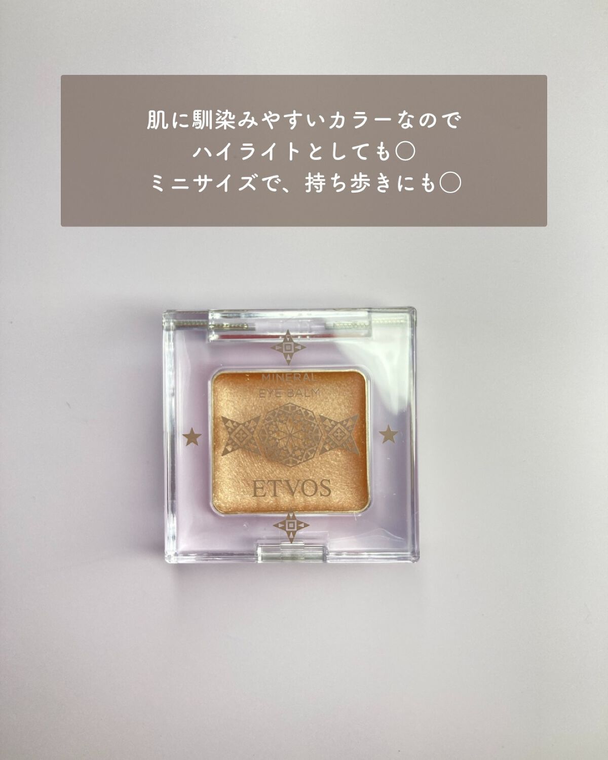 正直なめていました😅 ETVOSってミネラルコスメだから発色も色もちもよくないと思っていました… 色もちよすぎ! そしてラメがきれいすぎる! デパコスのルナソルやスックと同じくらいラメがきれいだと思うのわたしだけ?! 高級感がでて幸せな気分になる😍 濡れツヤまぶたが好きな方は使ってみてほしい〜!