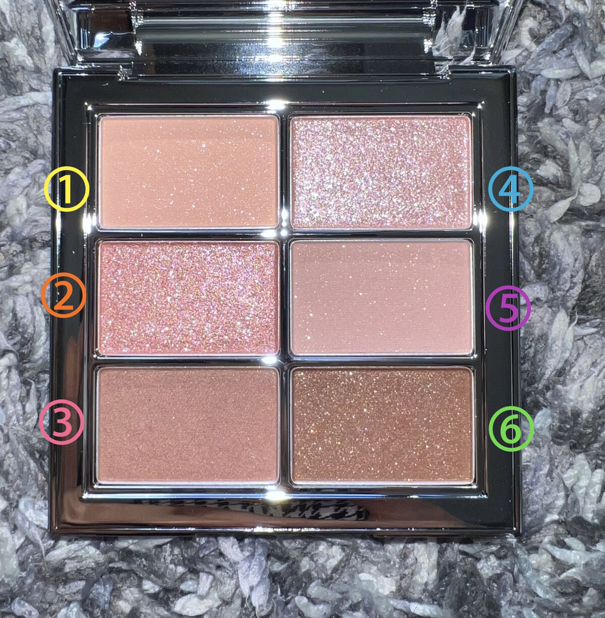 - シアーマット、シアーサテン、シアーグリッターなどさまざまなテクスチャーが入った6色構成のヴィーガンアイシャドウパレット。落ち着いたヌードベースと暗めのピンクベースがトーンオントーンで構成され、誰でも簡単にレイヤリングを楽しめます。さらには鮮やかな透明グリッターが爽やかな輝きを演出し、しっとりソフトな水分感のあるテクスチャーで、塗りやすく粉飛びなしの完璧なフィット感を実現。ほのかに優しい発色がナチュラルで美しい目元へと導きます。