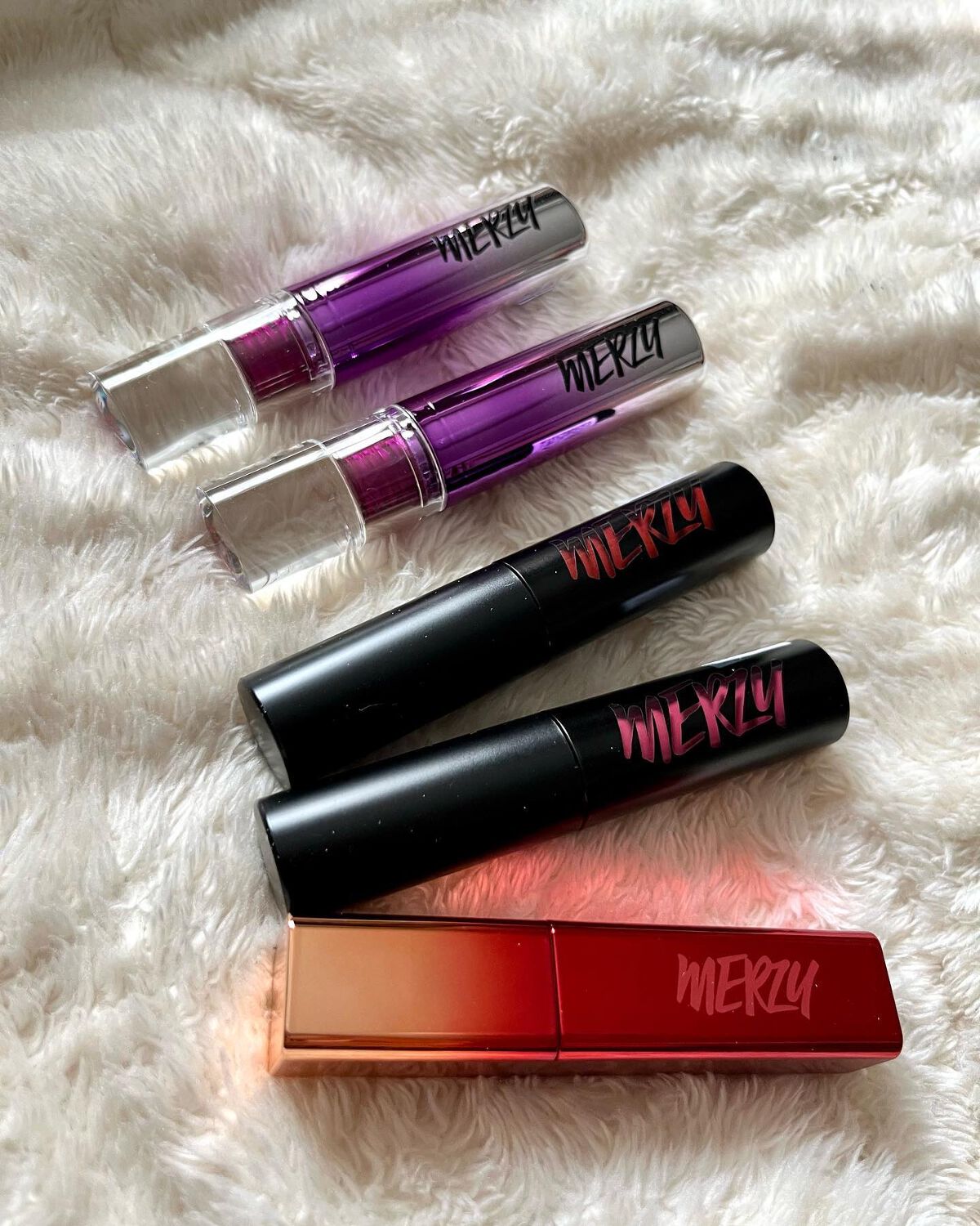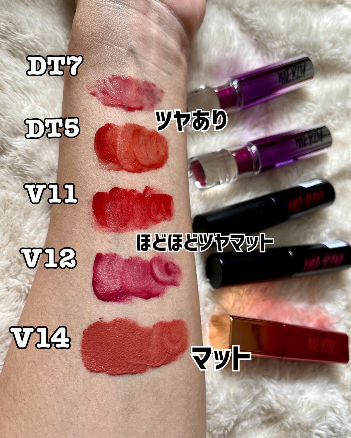 ツヤもあるマットなティント✨ 1度塗りでしっかり色も付いて、ティッシュオフしてもしっかりカラーが残る❗️ 個人的に1番上の"V7 OSLO MOOD"が、どんなメイクでも合わせやすい使い勝手の良さでお気に入り💗 ツヤツヤなティント✨ ツヤツヤで肌馴染みの良いカラー❗️ ティッシュオフすると薄くカラーが残る感じ‼️ でもそれが個人的にはお気に入り💗 ちなみに"DT.7 MYSTIC MAUVE"がお気に入り! ナチュラルカラーでその日の気分でオフせずツヤツヤぷるん!な唇にしたり、オフしたあと唇の色に近いナチュラルなカラーだからこその、血色の良い唇を作ってくれるのでお気に入り💗 MERZYはたくさんの種類があって 自分好みのティントが見つかると思う💫 塗り心地も、発色も色持ちも良くってお勧め🤤