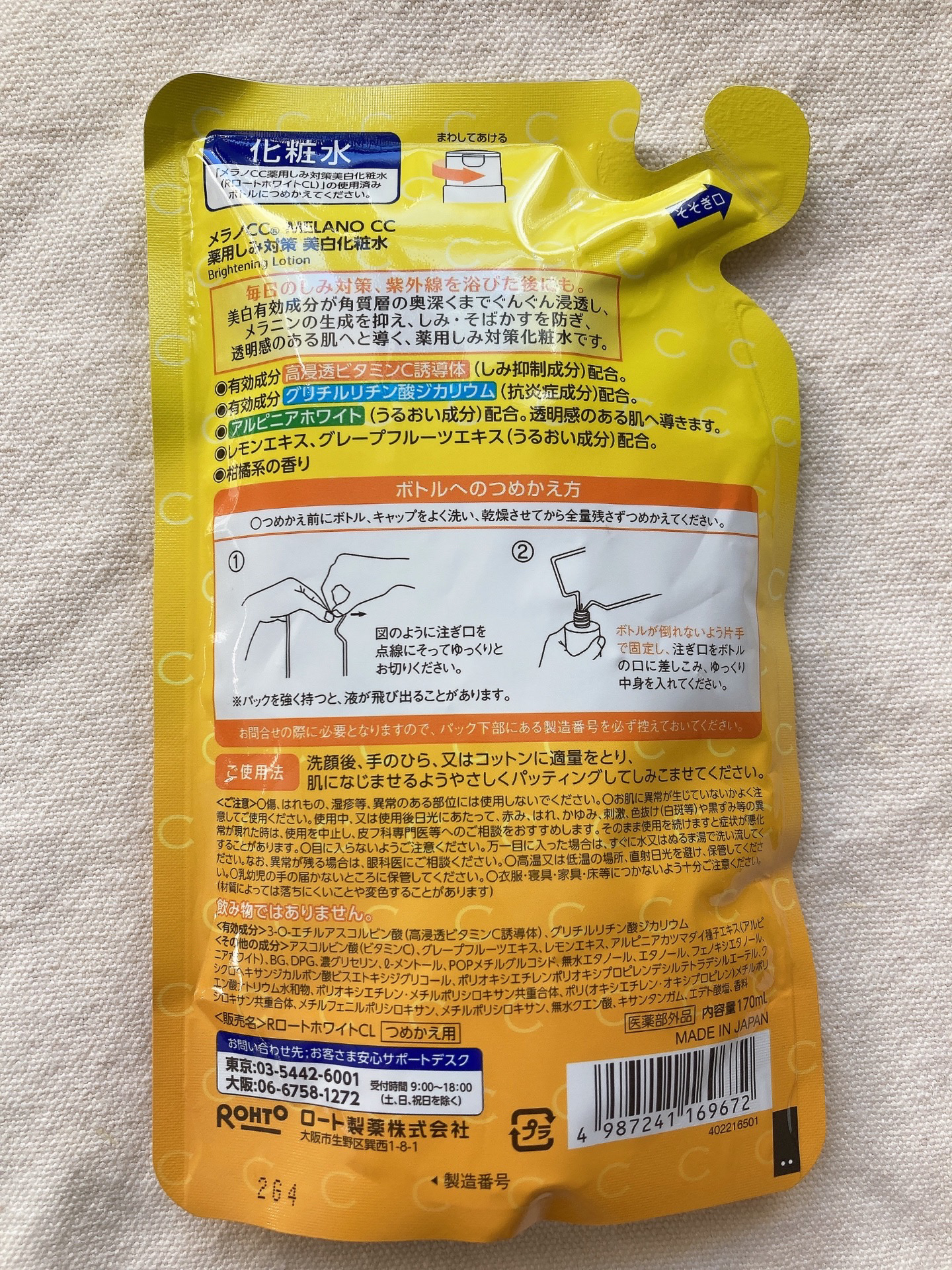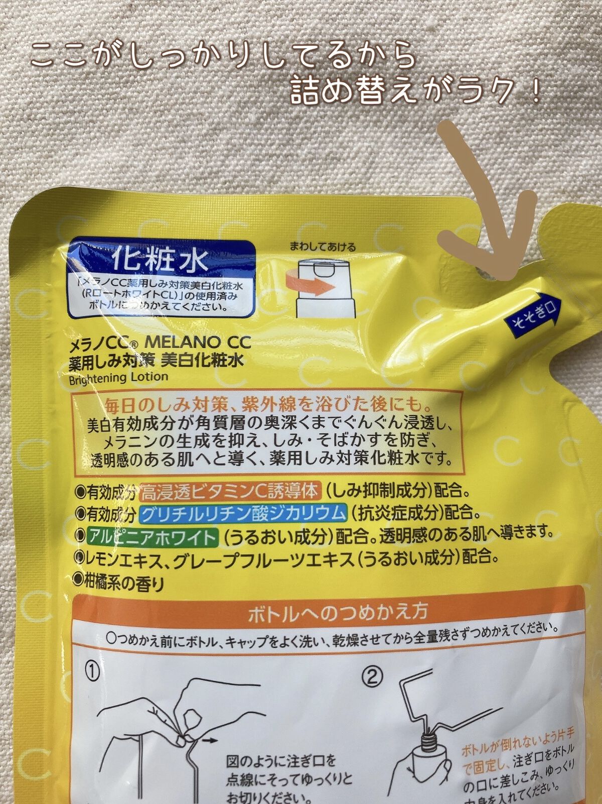 - 「メラノCC 薬用しみ対策 美白化粧水」は、顔全体にうるおいを与えながら、しみ対策できる薬用美白化粧水。 美白有効成分高浸透ビタミンC誘導体*1が角質層すみずみまで浸透し、メラニンの生成を抑え、しみ・そばかすを防ぎ、透明感のある肌へと導きます。 また、抗炎症成分*2と3種のうるおい成分*3を配合。ニキビ痕が気になる肌にもうるおいを与え、肌を整えます。 さわやかな柑橘系の香りです。 *1:3-O-エチルアスコルビン酸 *2:グリチルリチン酸ジカリウム *3:アルピニアホワイト、レモンエキス、グレープフルーツエキス