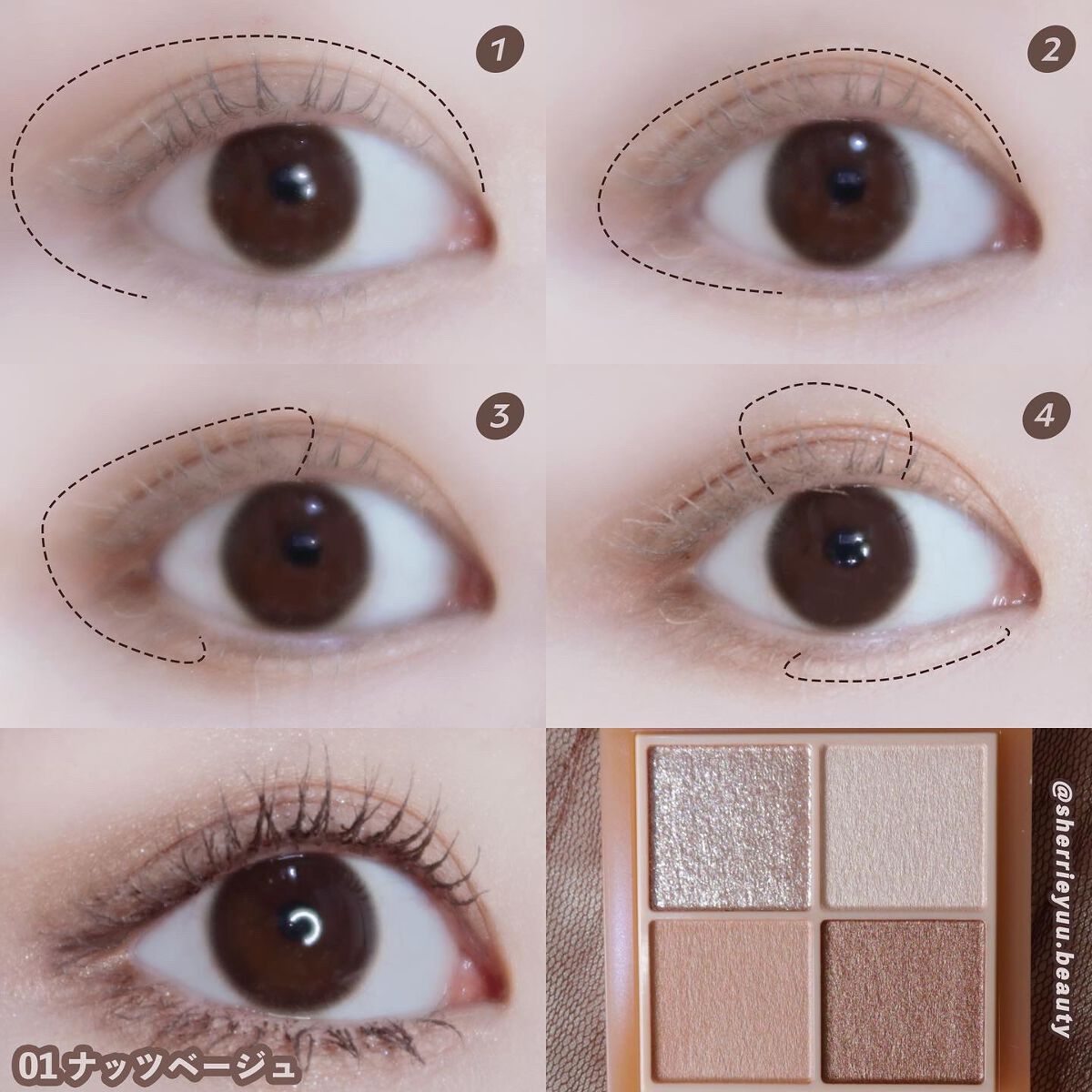 - ラメ・パール・マット3質感の4色アイシャドウ。 肌馴染みの良いベージュを基調としたカラー。ラメ・パール・マットの3質感を重ねて、自然にまぶたを強調し奥行のある大きな目元へ。 しっとり溶け込むような柔らかなパウダーなので、スルスル伸びてまぶたにピタッと密着。保湿成分(スクワラン・ホホバ種子油)配合。