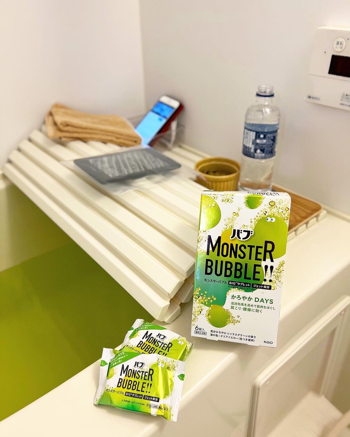 温浴効果を高めて筋肉をほぐし 肩こり・腰痛に効く かろやかDAYS 気分かろやかシトラスグリーンの香り。 シトラスグリーンの爽やかな香りもとても良かったです。全体的な使用感から、「かろやかDAYS」というネーミングは本当にこの商品にピッタリだなと思いました💗 990円で6錠入りなので、同じ値段で4個入りのモンスターバブルMEGA級と比較すると少しお安め。
