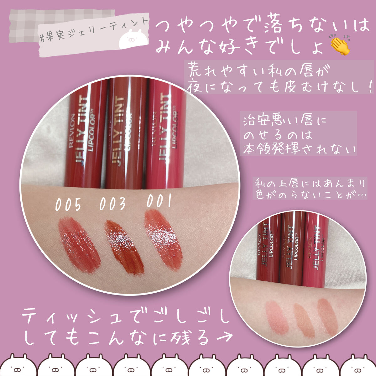 発色抜群、夜まで綺麗が保たれる質感ミックスアイシャドウ 色持ち抜群、つやつやぷるぷる果実ジェリーティント グリッター、パール、サテン、マット の4種類の質感が 1つのパレットに勢揃い! サテンの質感、発色加減が絶妙でお気に入りです。 ティントなのに荒れないじゃんすごいぞ…という第一印象です。 ティッシュオフしてもツヤが残ったままなのでここも嬉しいポイント。 塗ってから時間をおいて、ティッシュオフorマスク がいいと思います。 発色良くてキラキラ ラメラメなアイシャドウが欲しいわツヤぷる唇にしたいけど色落ちや色移りしないリップが欲しいわ