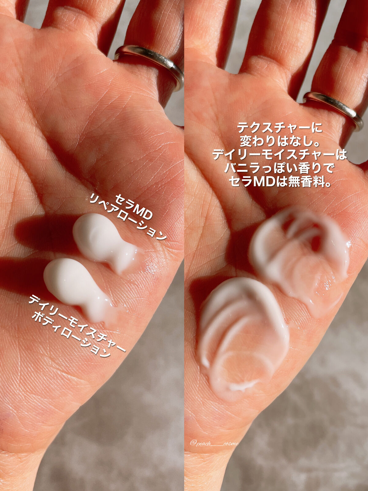 低刺激弱酸性ボディローション🌿 セラMDリペアローションは、ほぼ無香なので香りに気をつけたい時でも全身にたっぷりと使える◎! しっとりとなめらかで肌馴染みも良く、苦手なベタツキ感も無くて使い心地がとても良い🪽 ボトルも太すぎず細すぎずの持ち上げやすい形状でプッシュ式だからパッと使えるのも◎